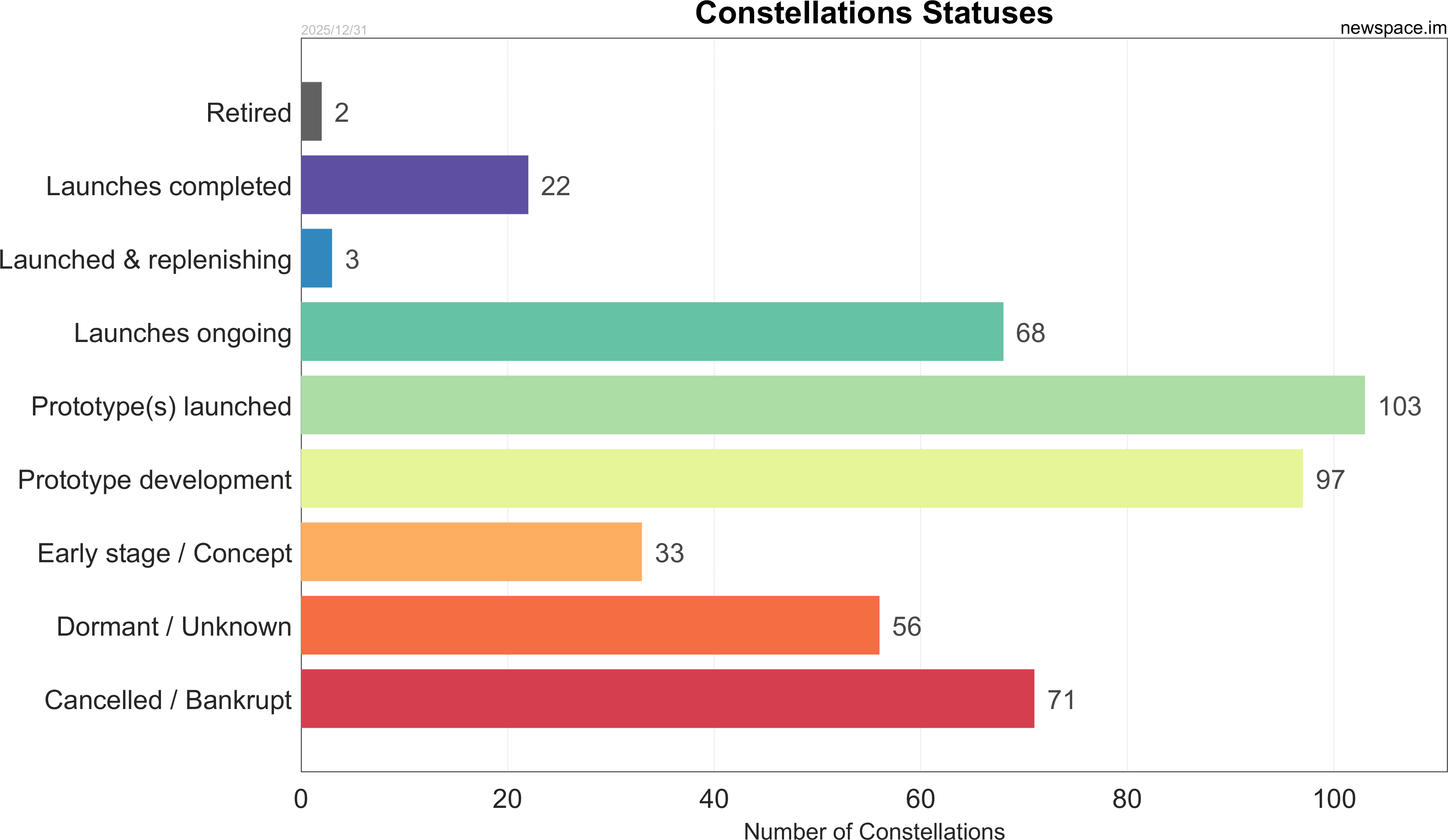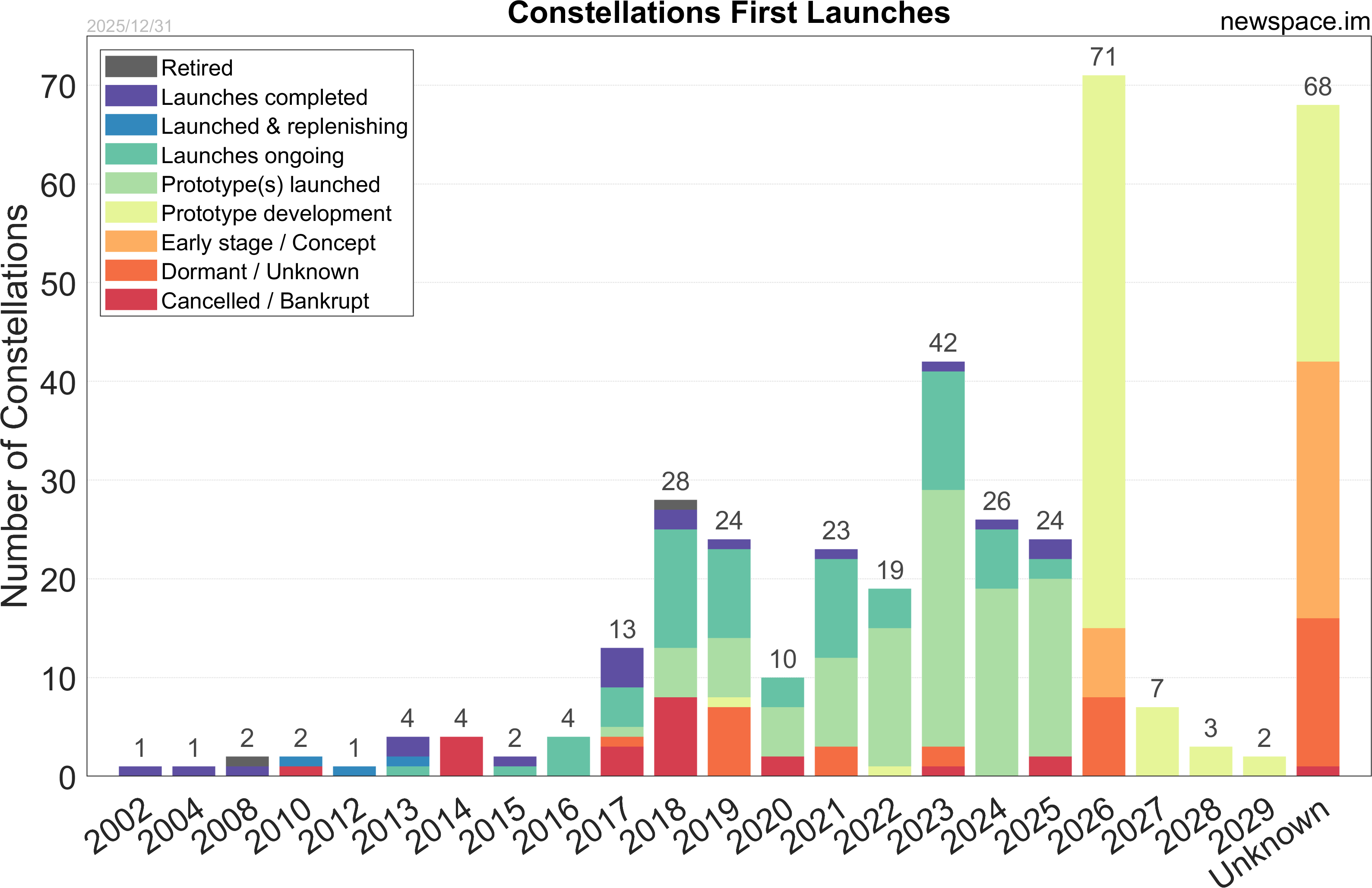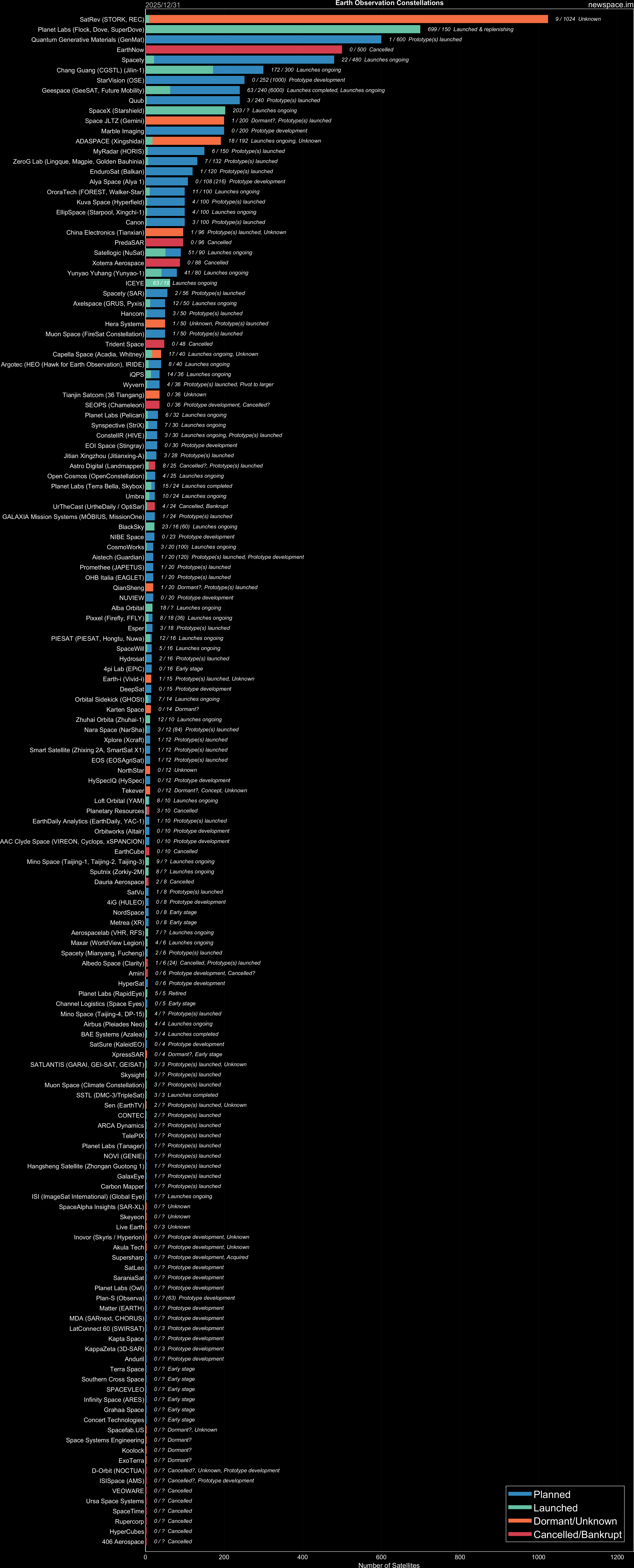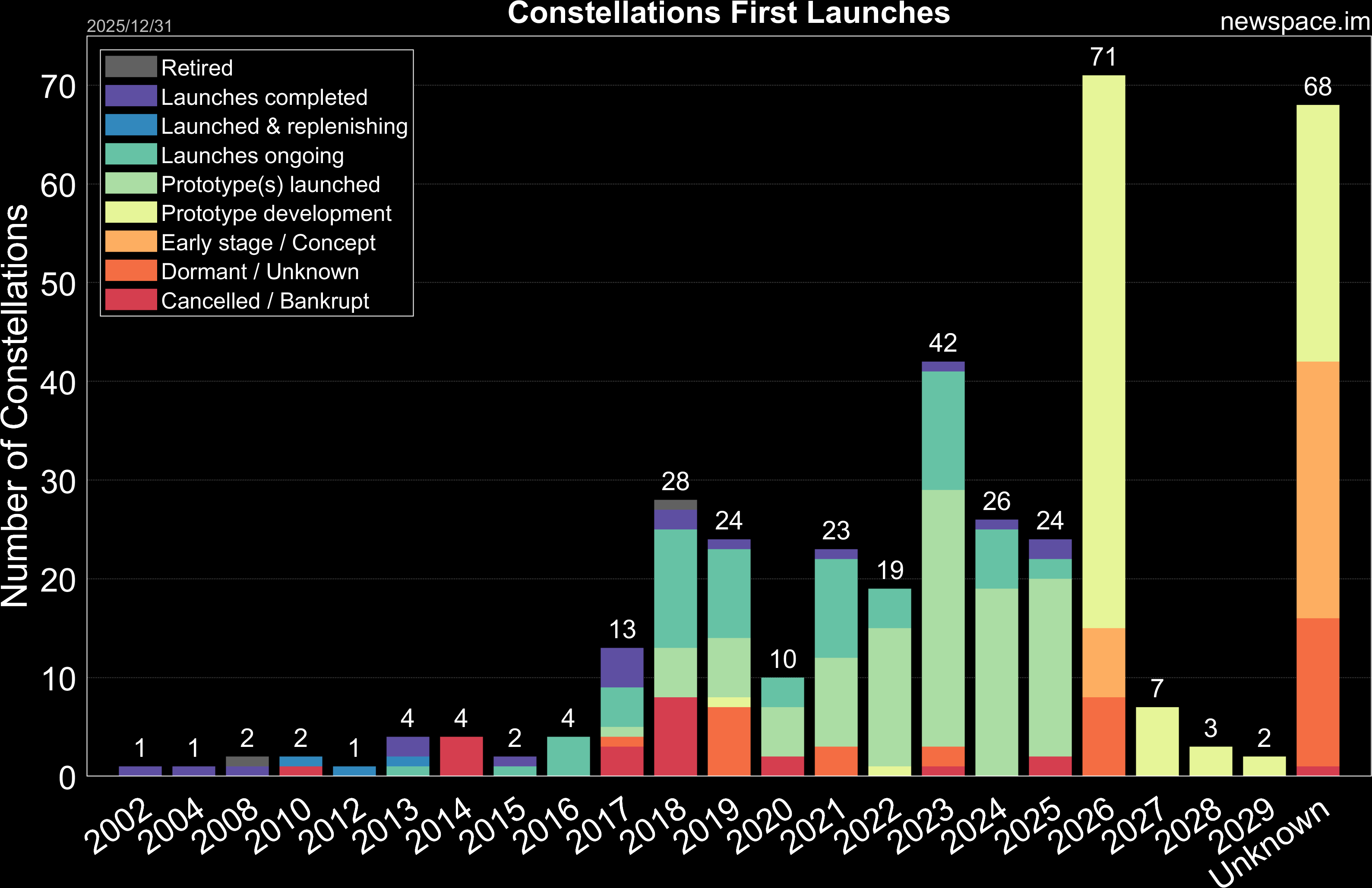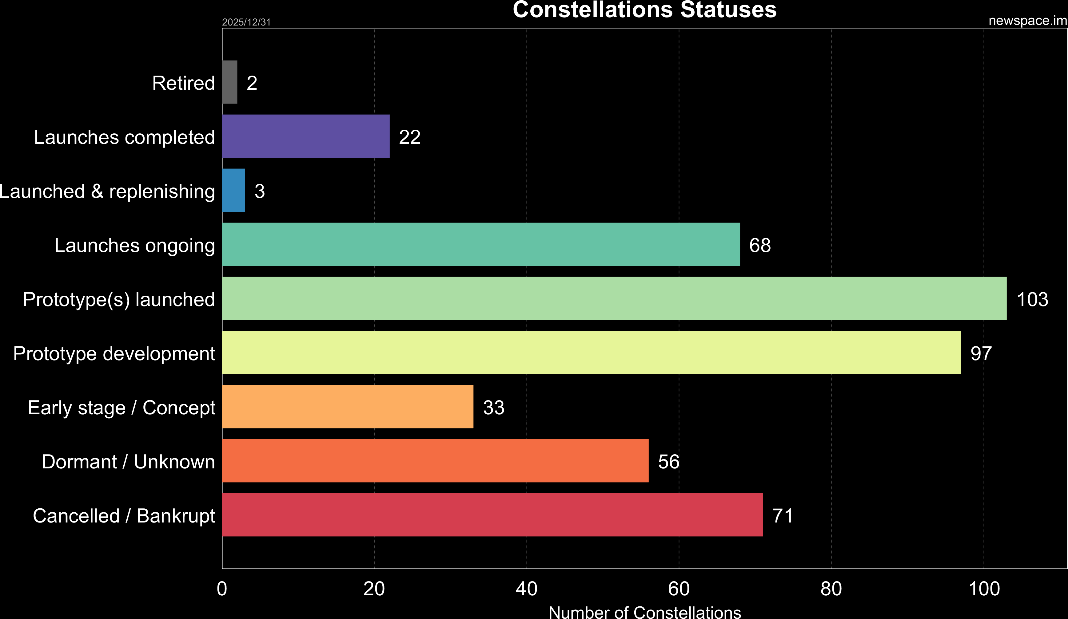 Launches ongoing - Constellation deployment of identical or similar satellites actively in progress or ramping up. Starlink and OneWeb are best examples.