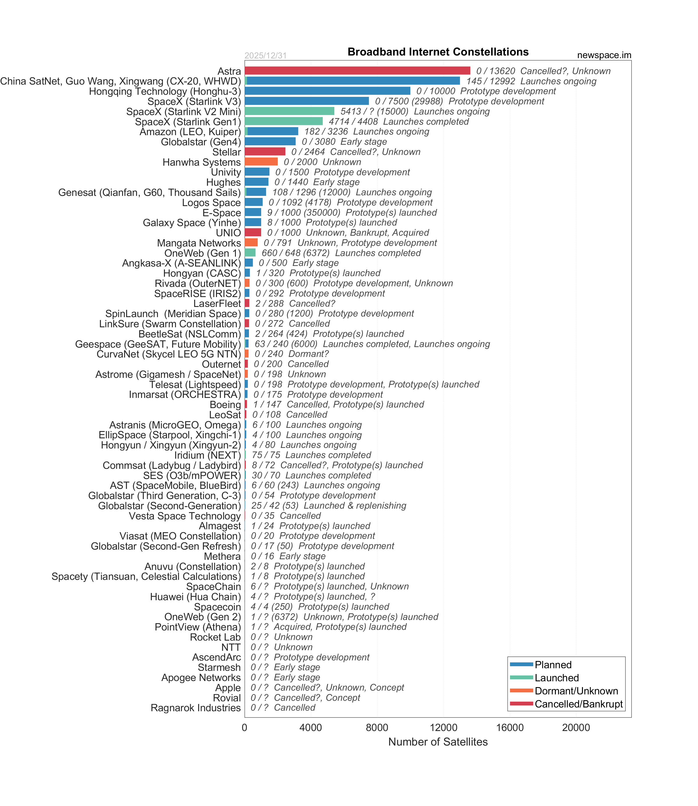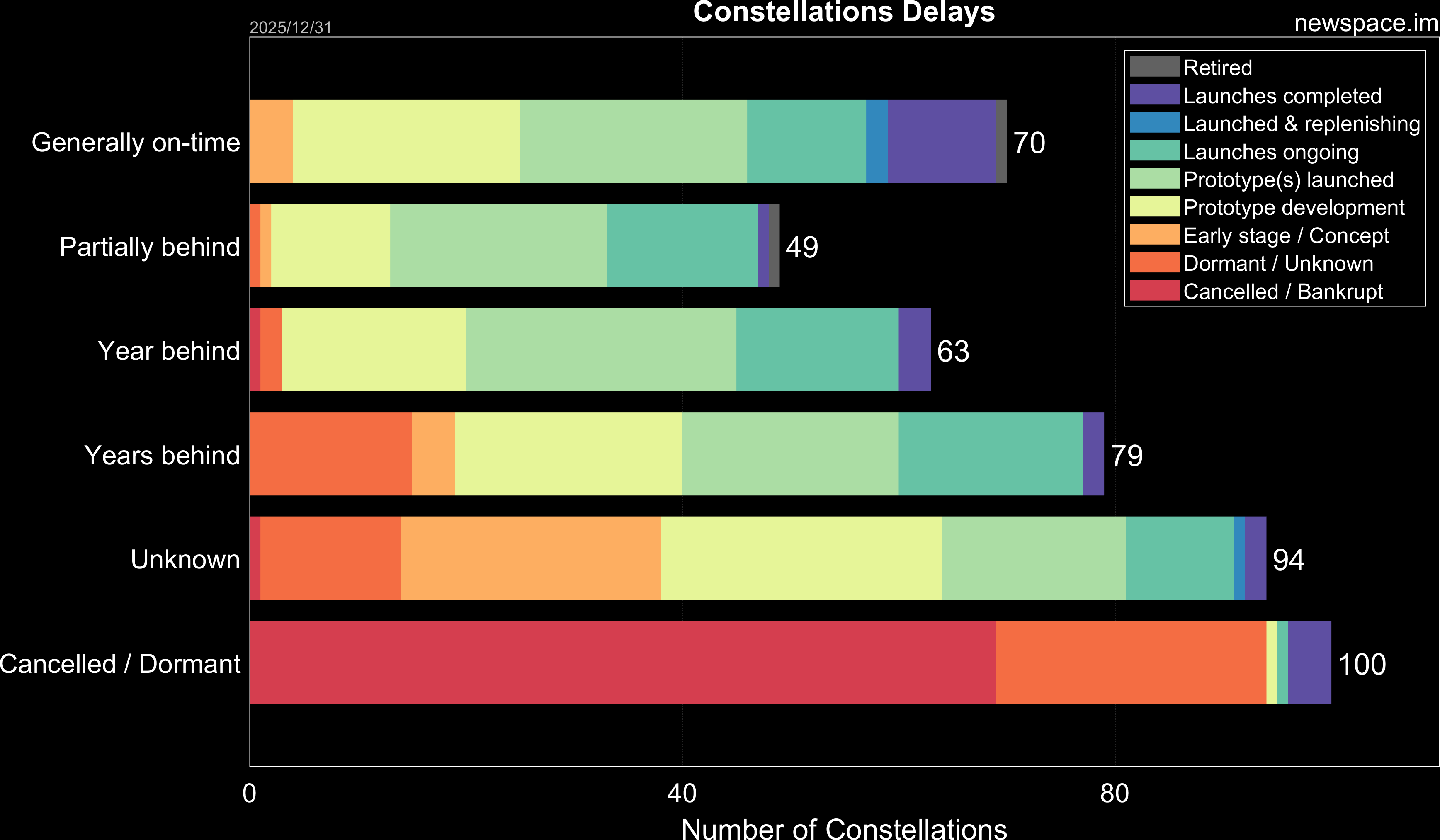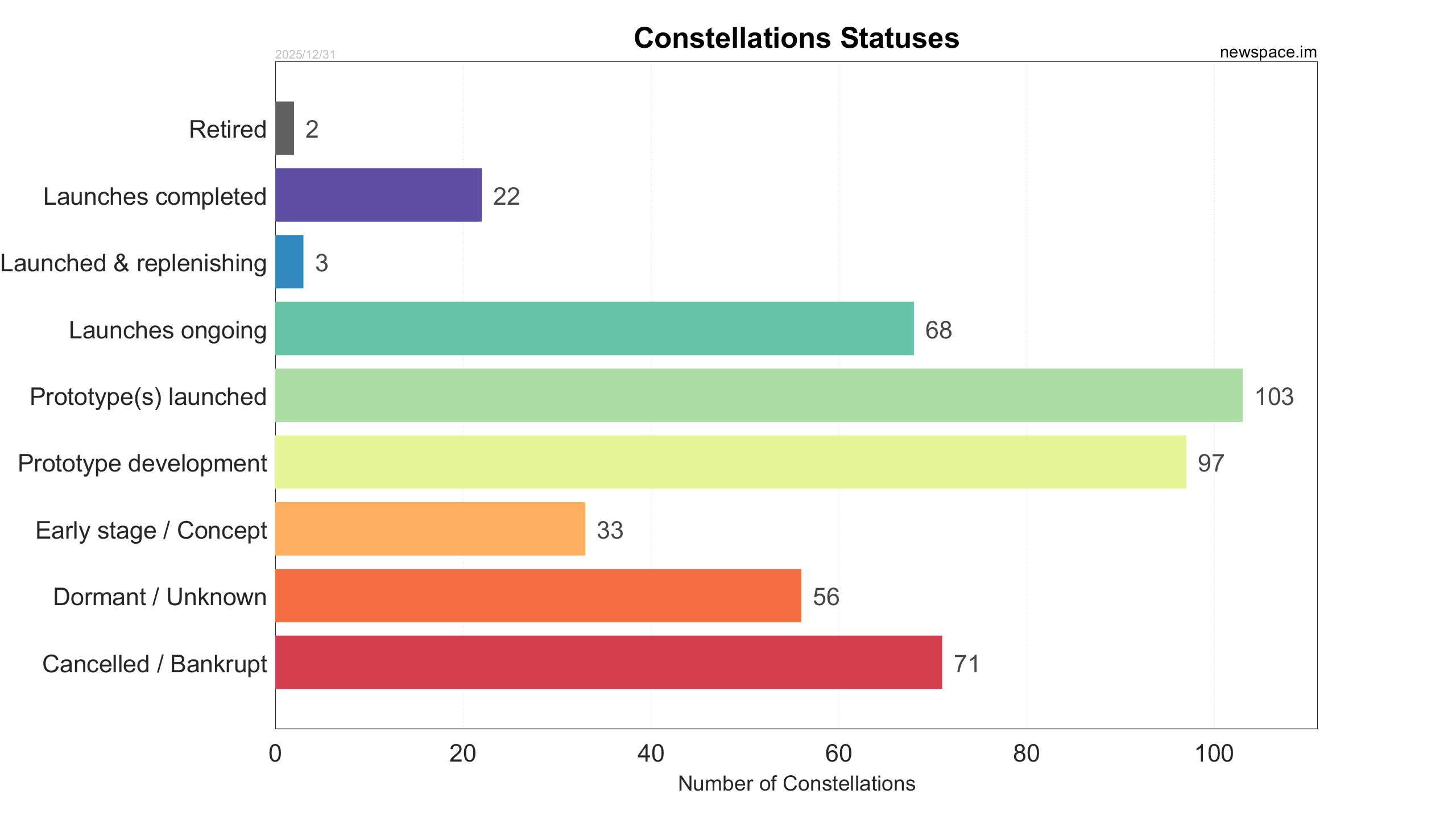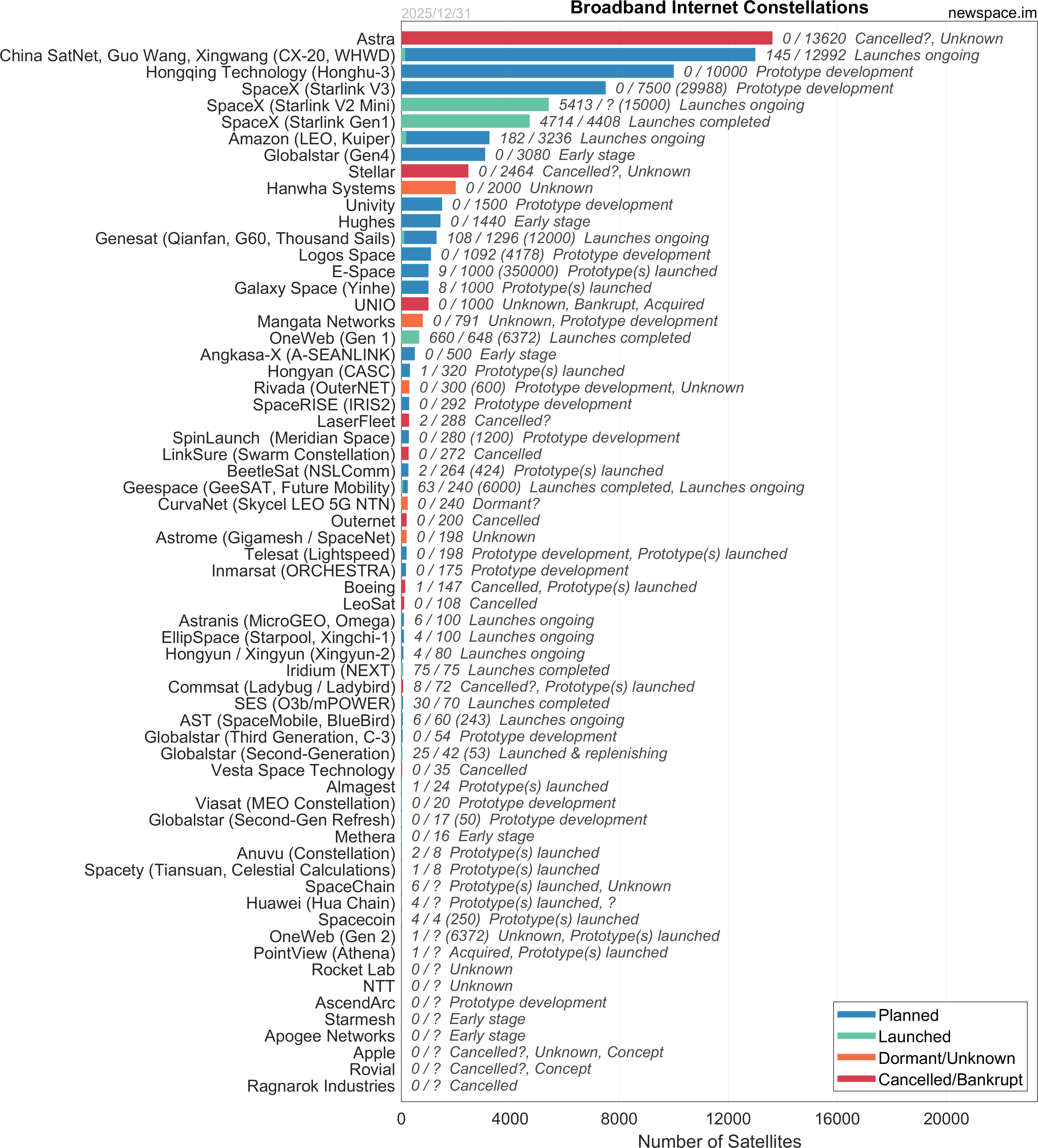 Launches ongoing - Constellation deployment of identical or similar satellites actively in progress or ramping up. Starlink and OneWeb are best examples.