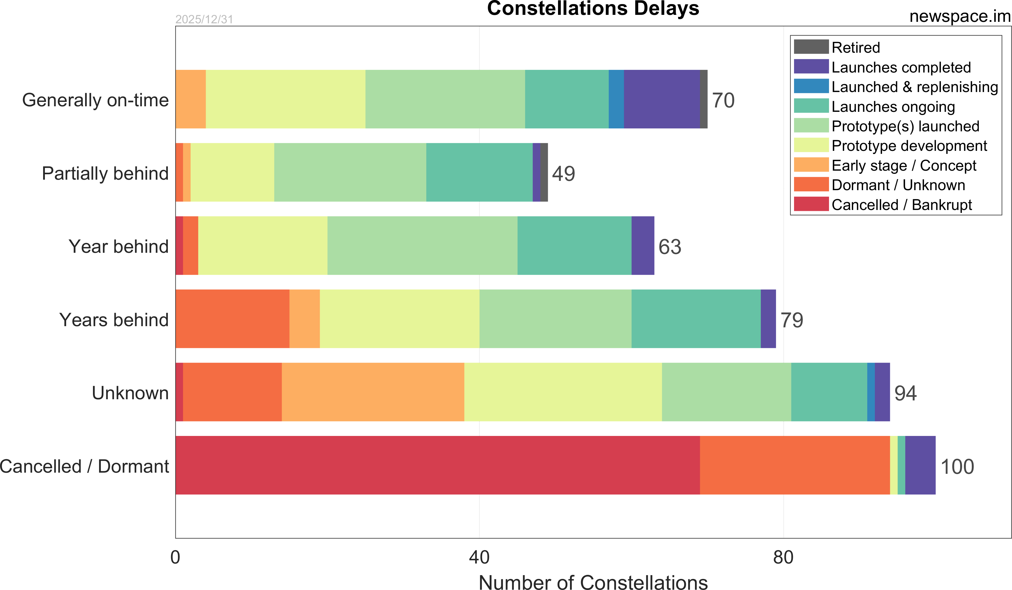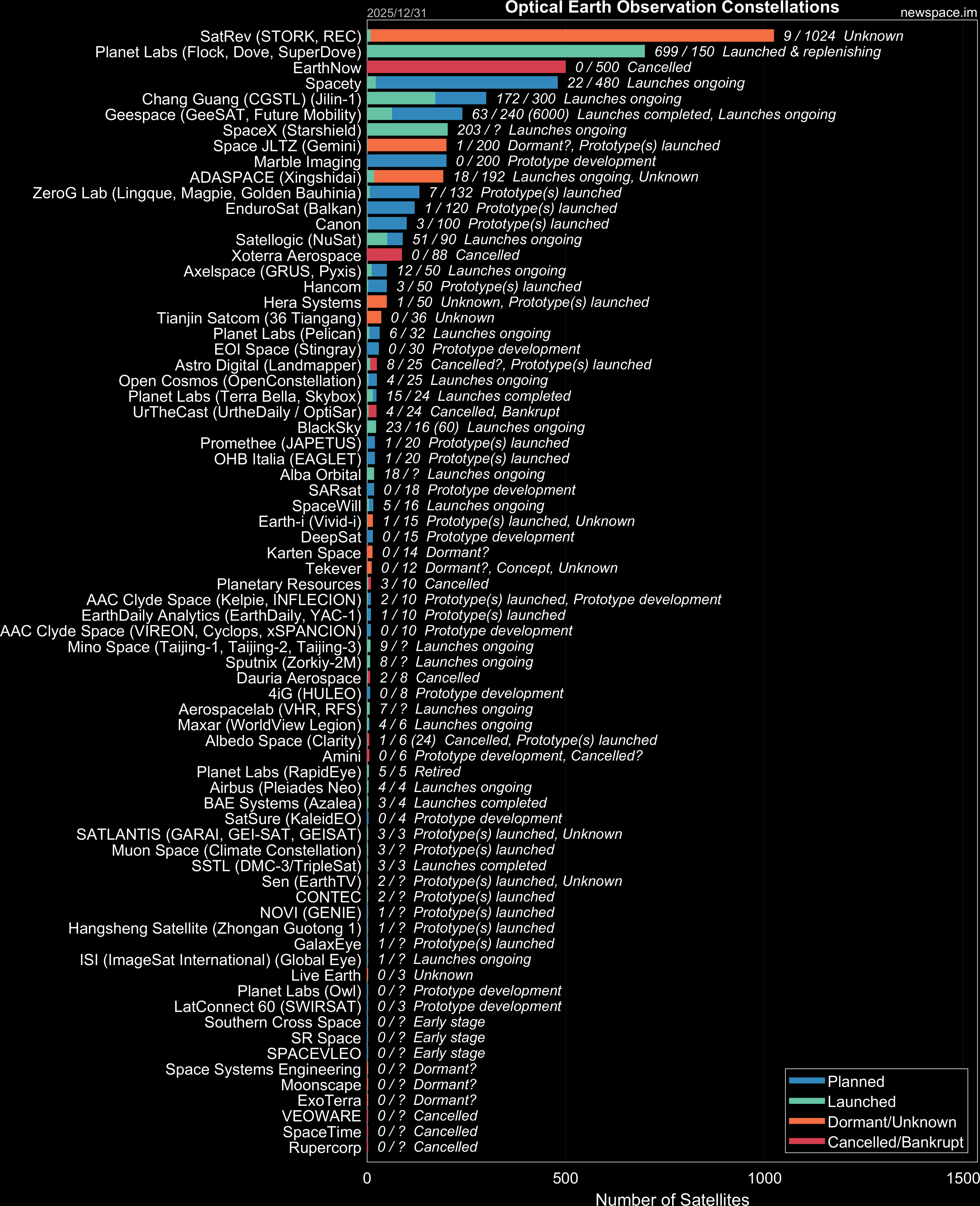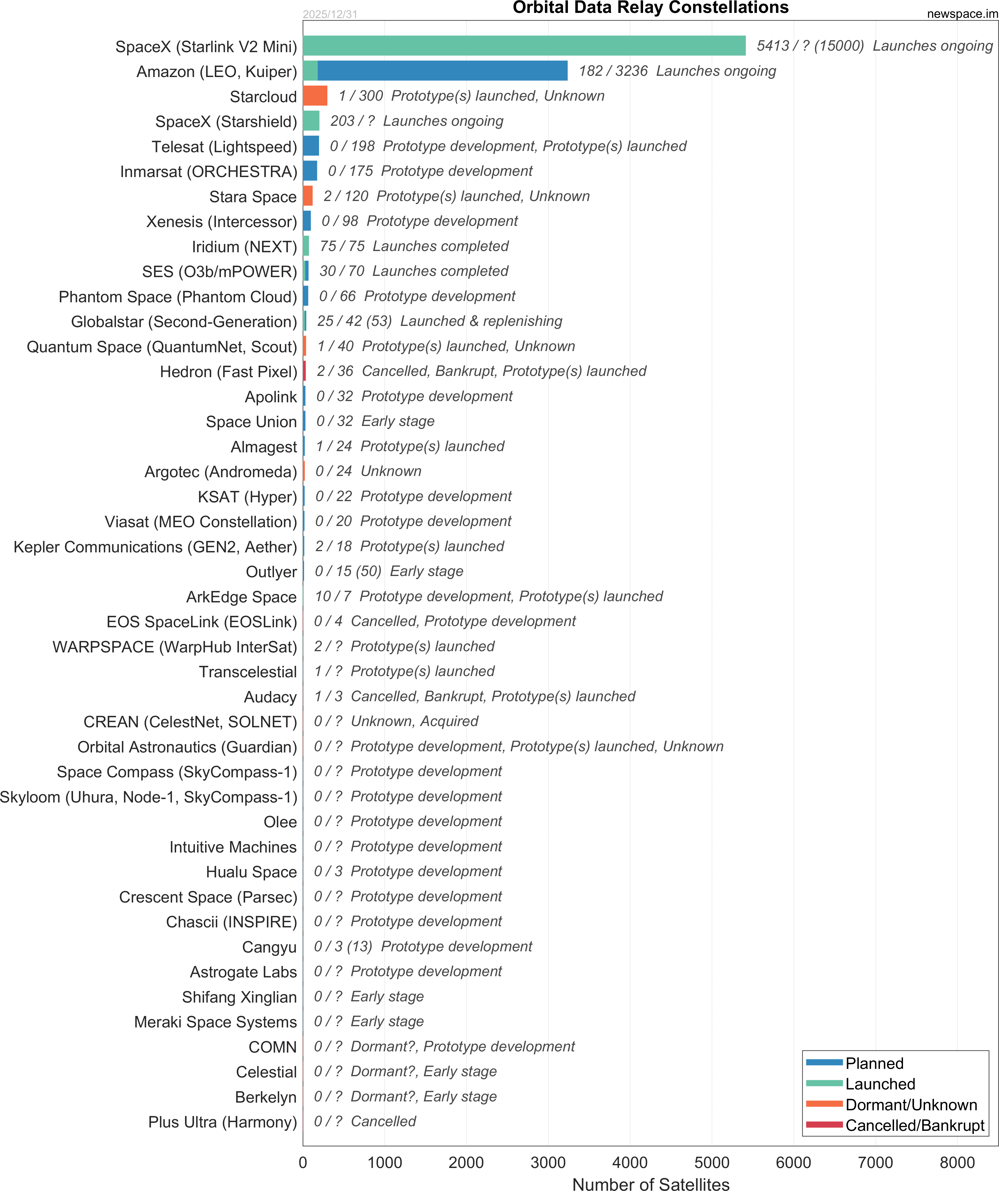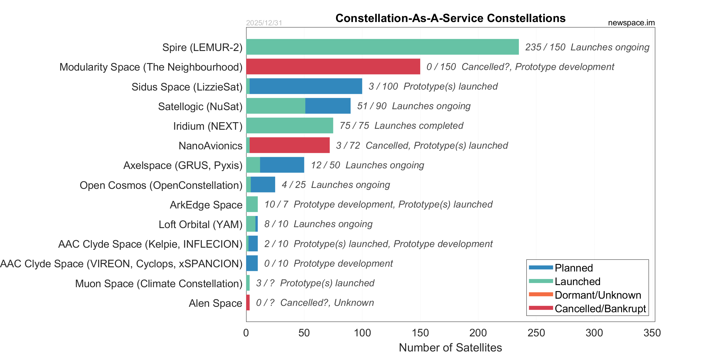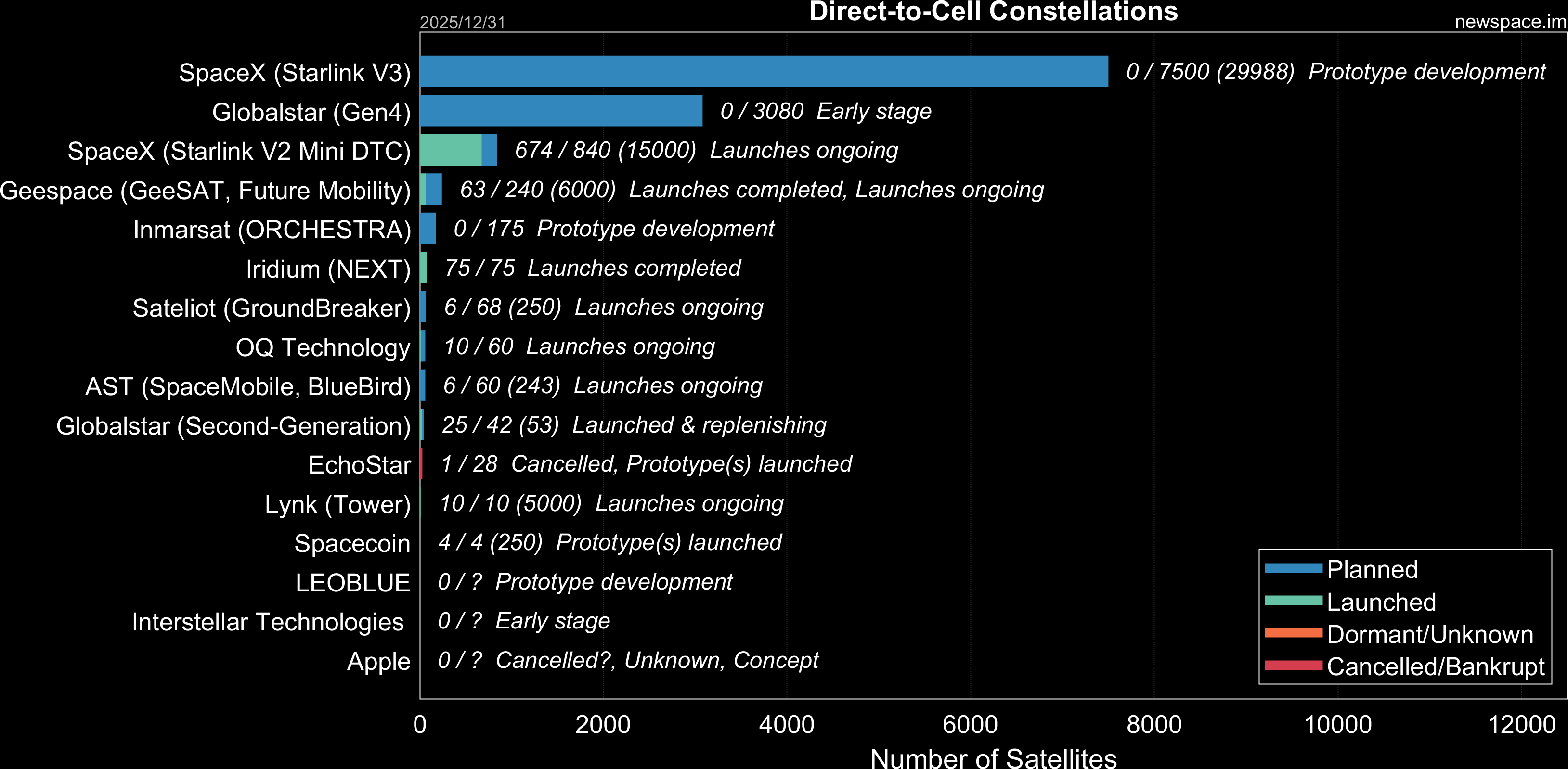 Launches ongoing - Constellation deployment of identical or similar satellites actively in progress or ramping up. Starlink and OneWeb are best examples.