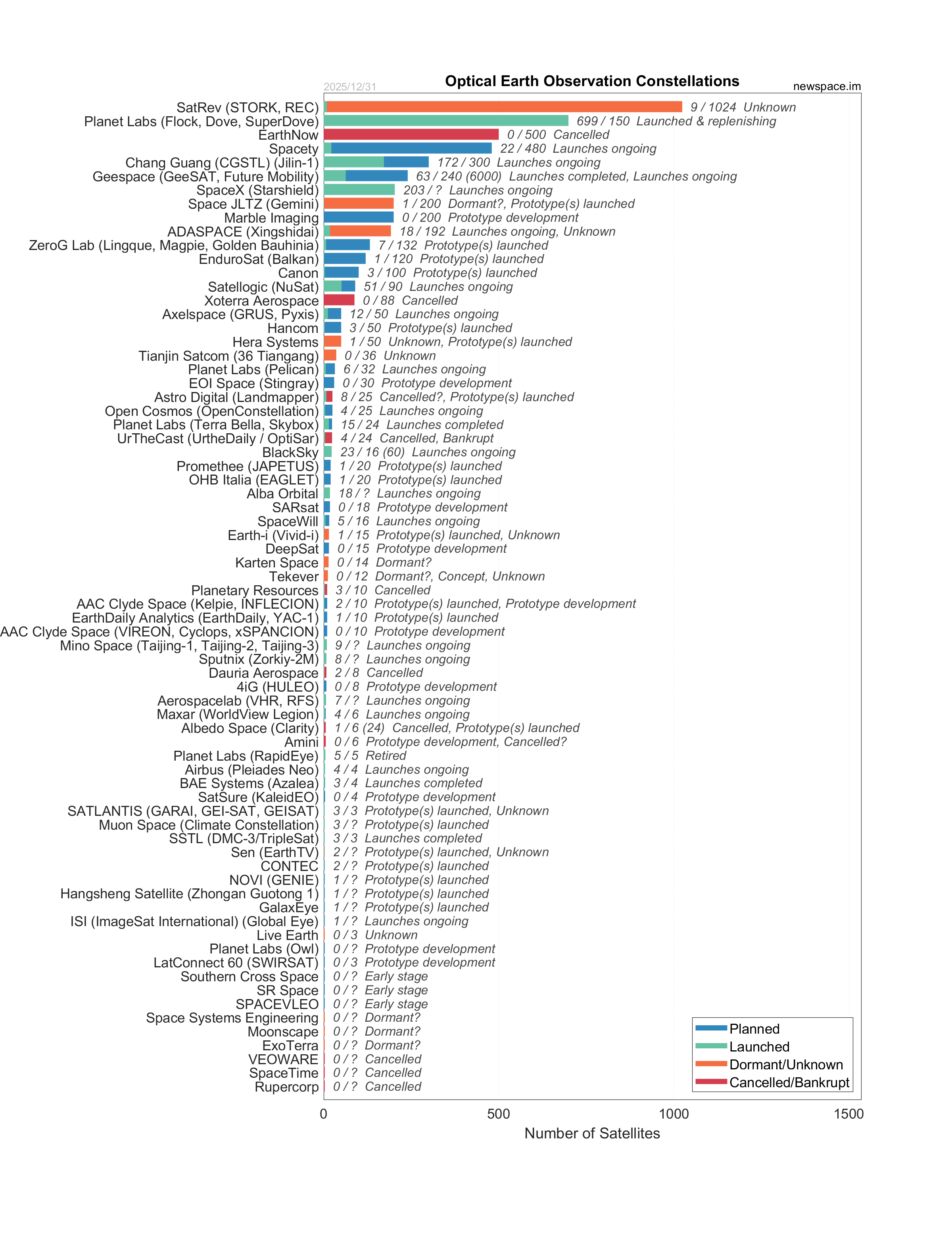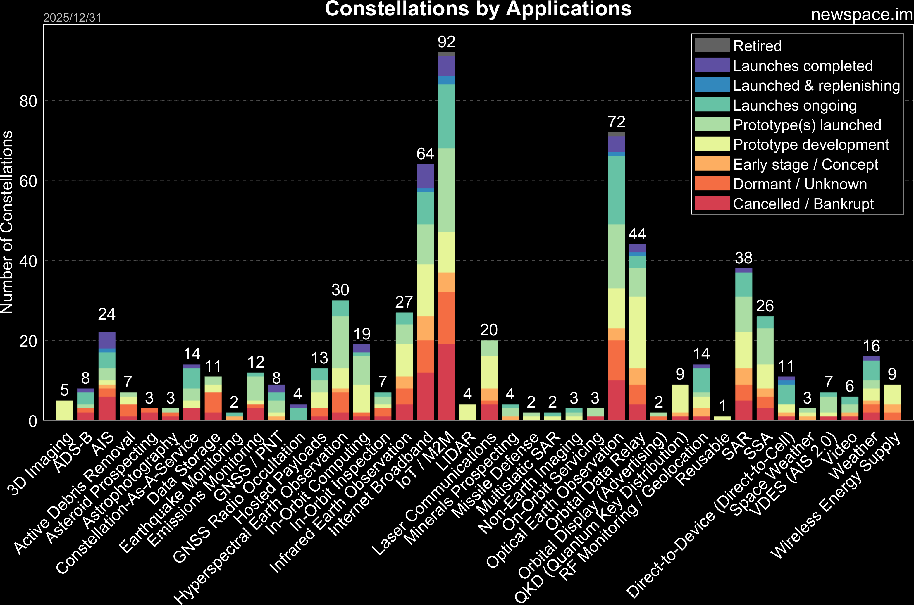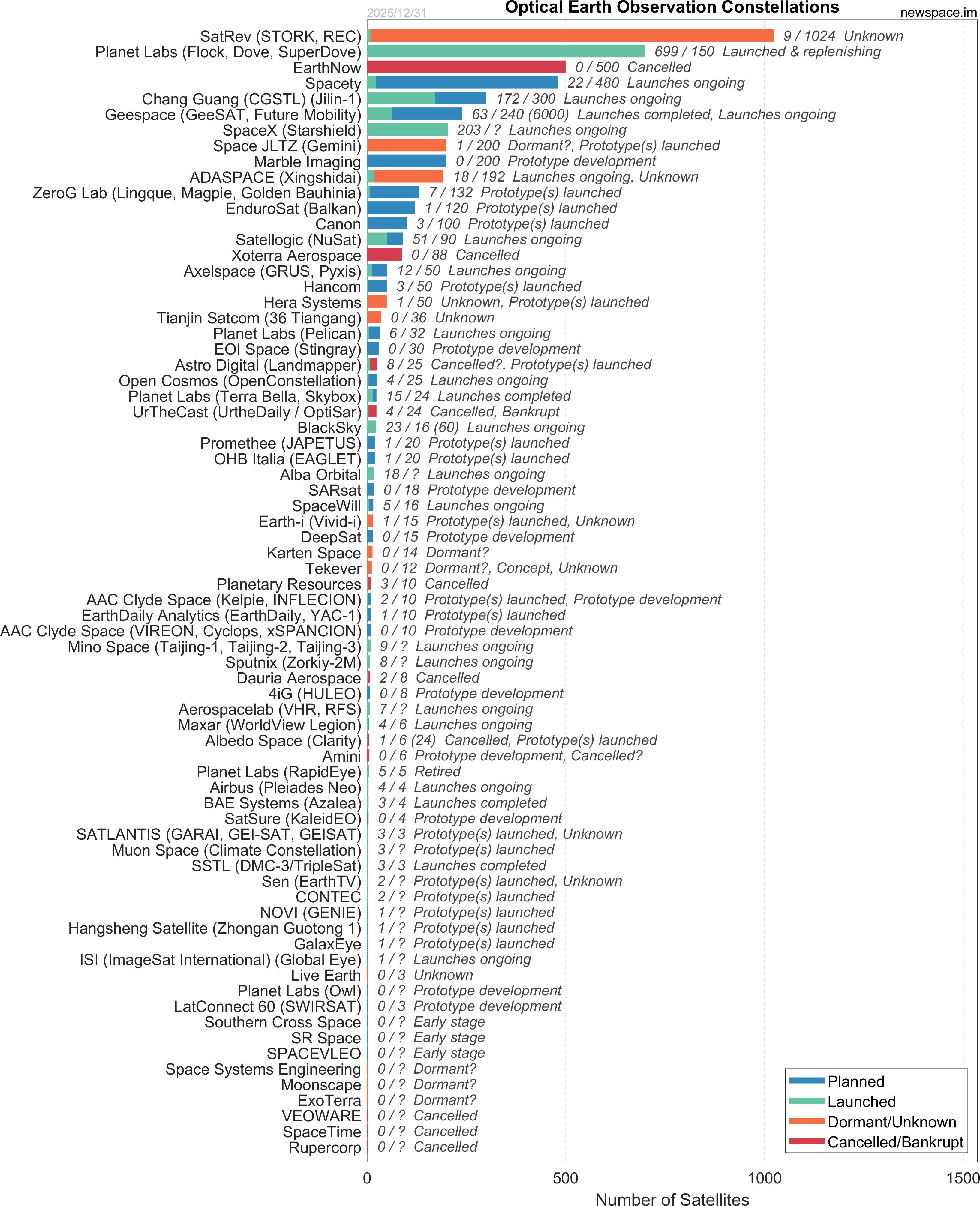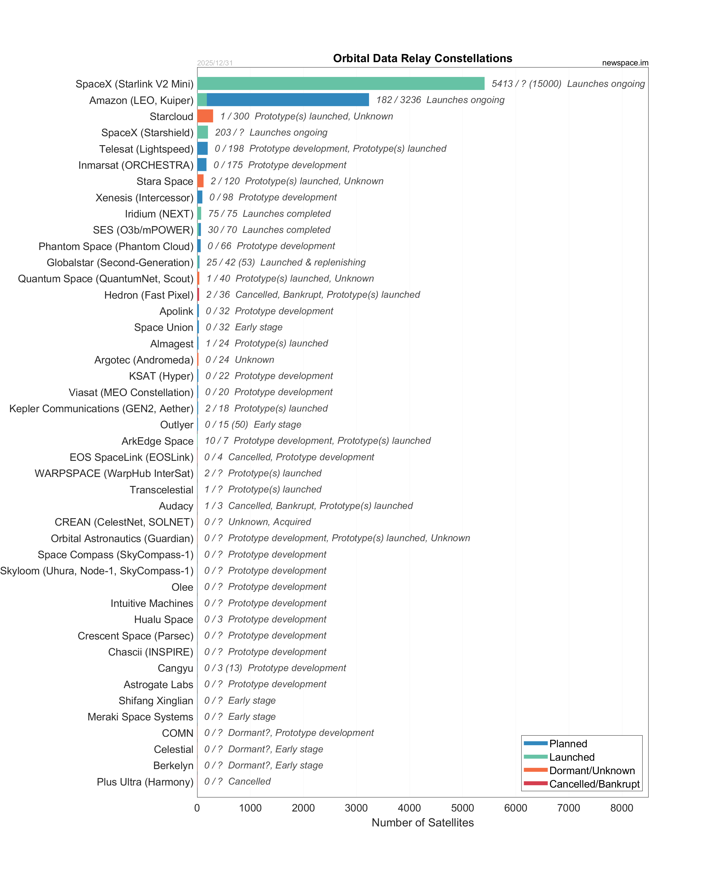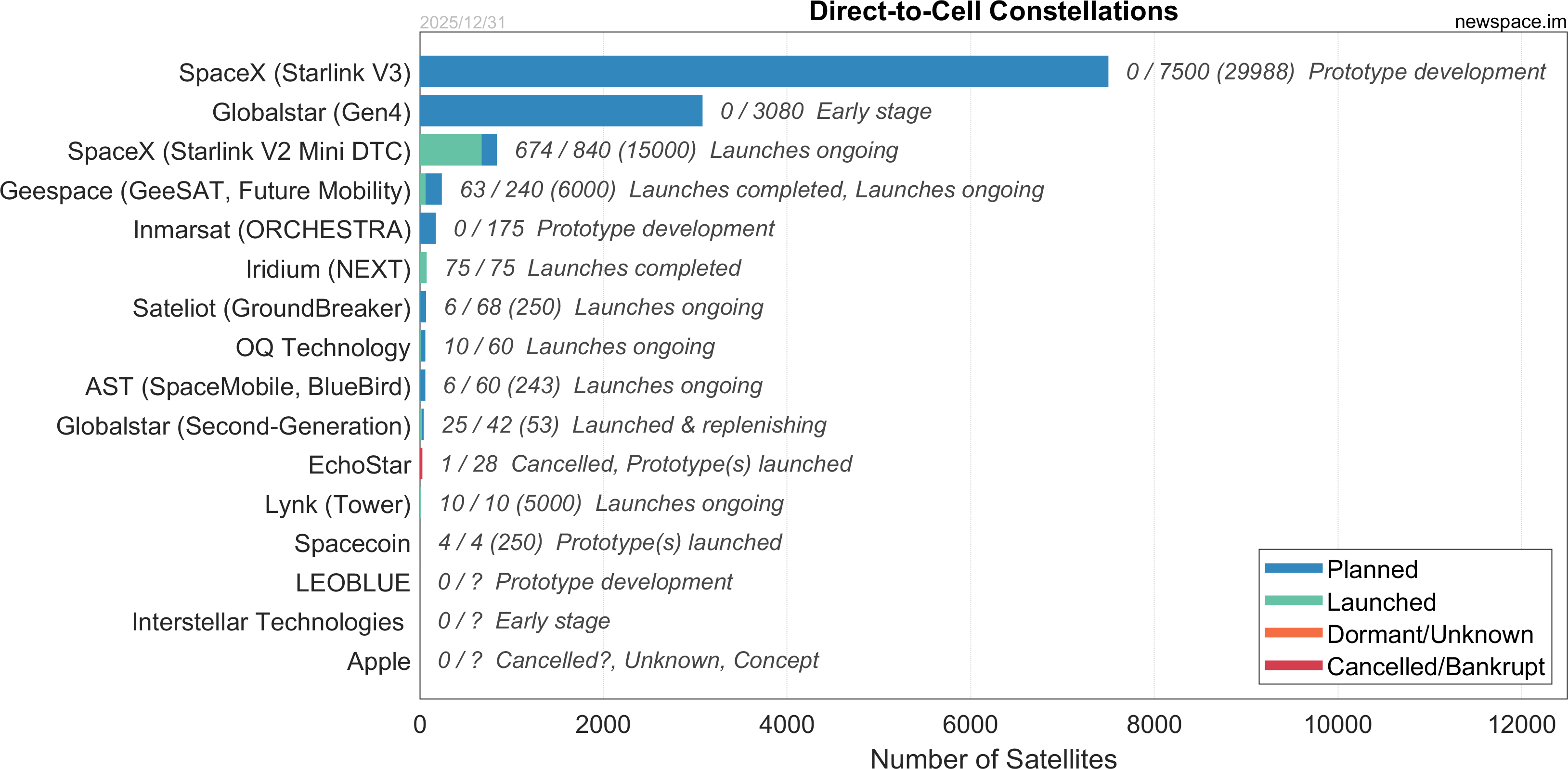 Launches ongoing - Constellation deployment of identical or similar satellites actively in progress or ramping up. Starlink and OneWeb are best examples.