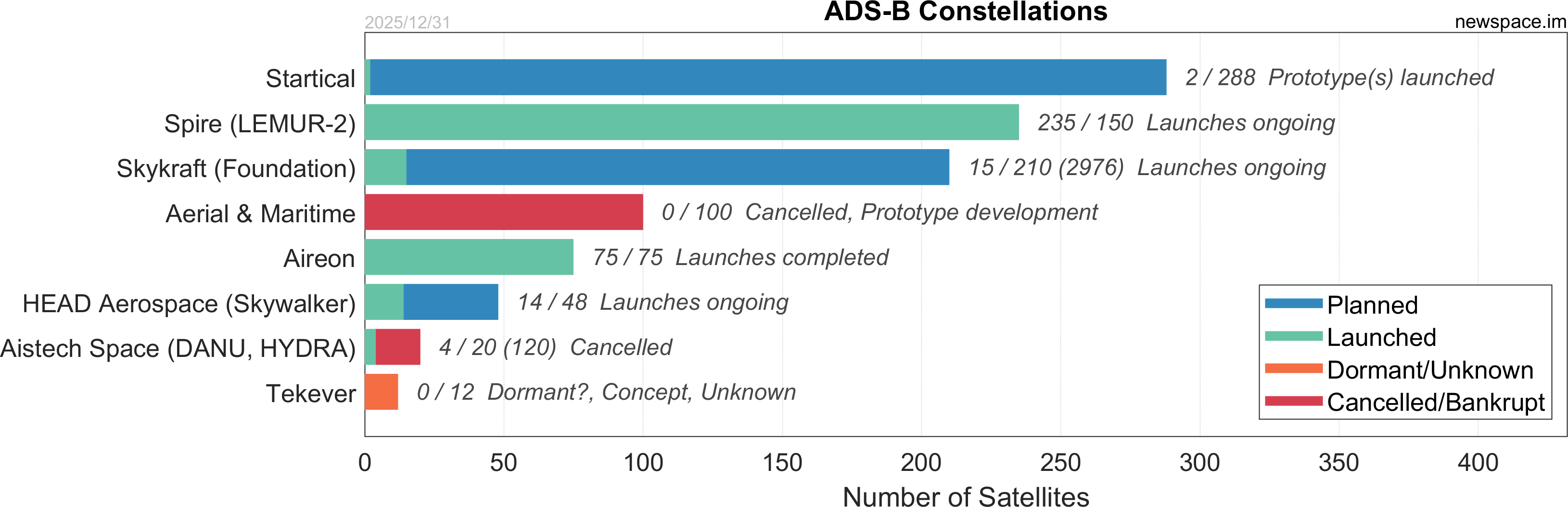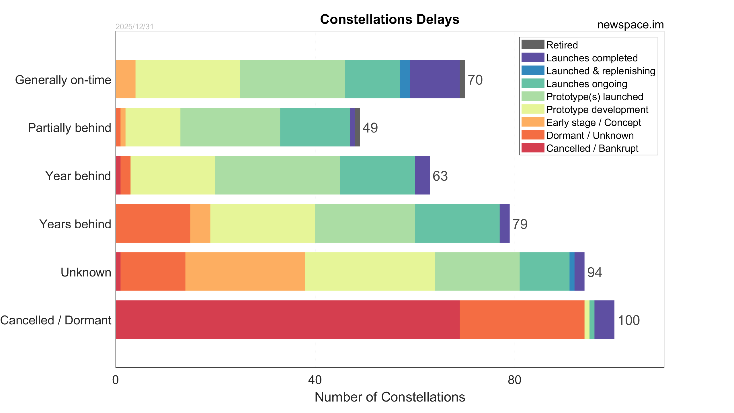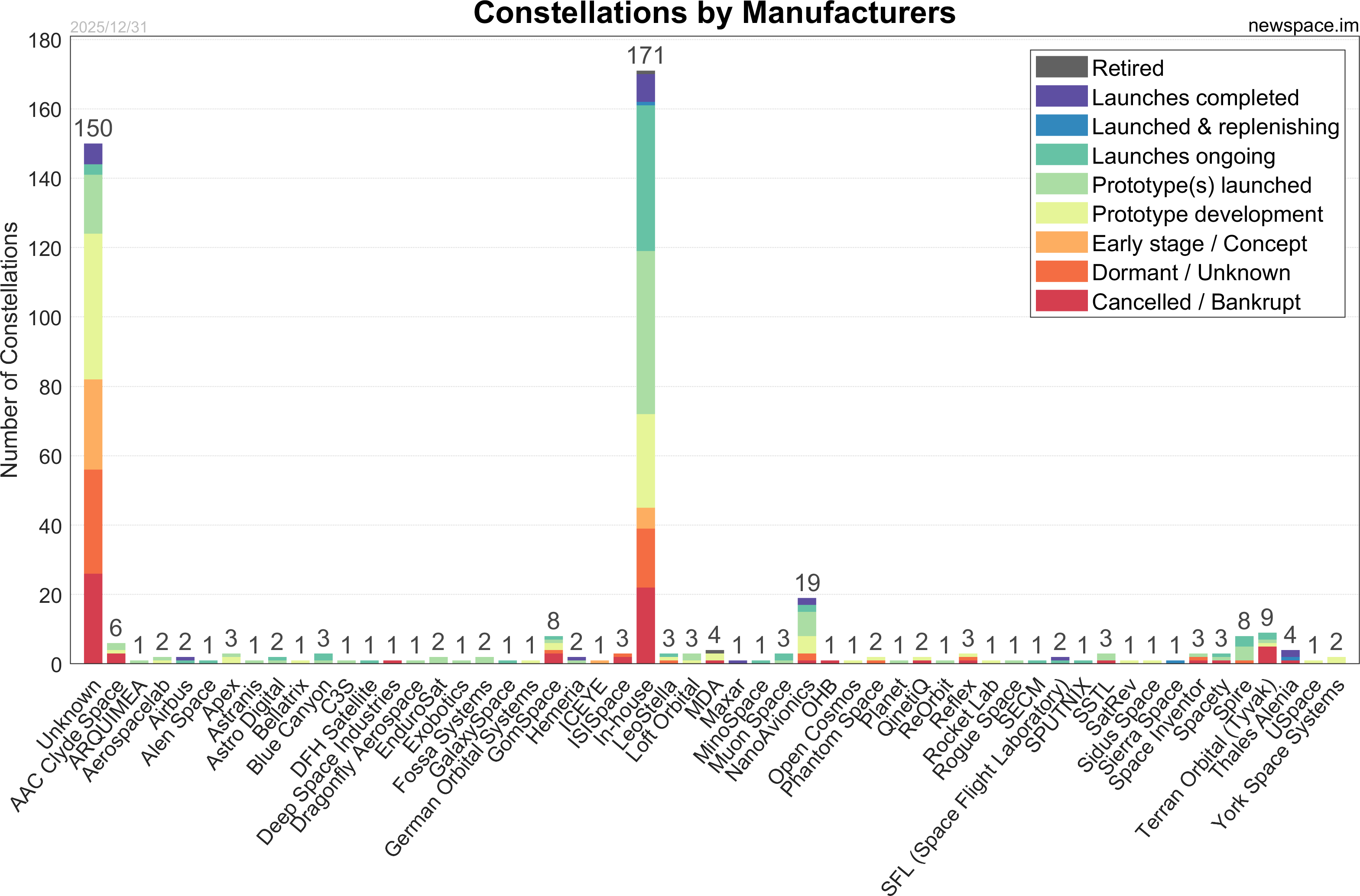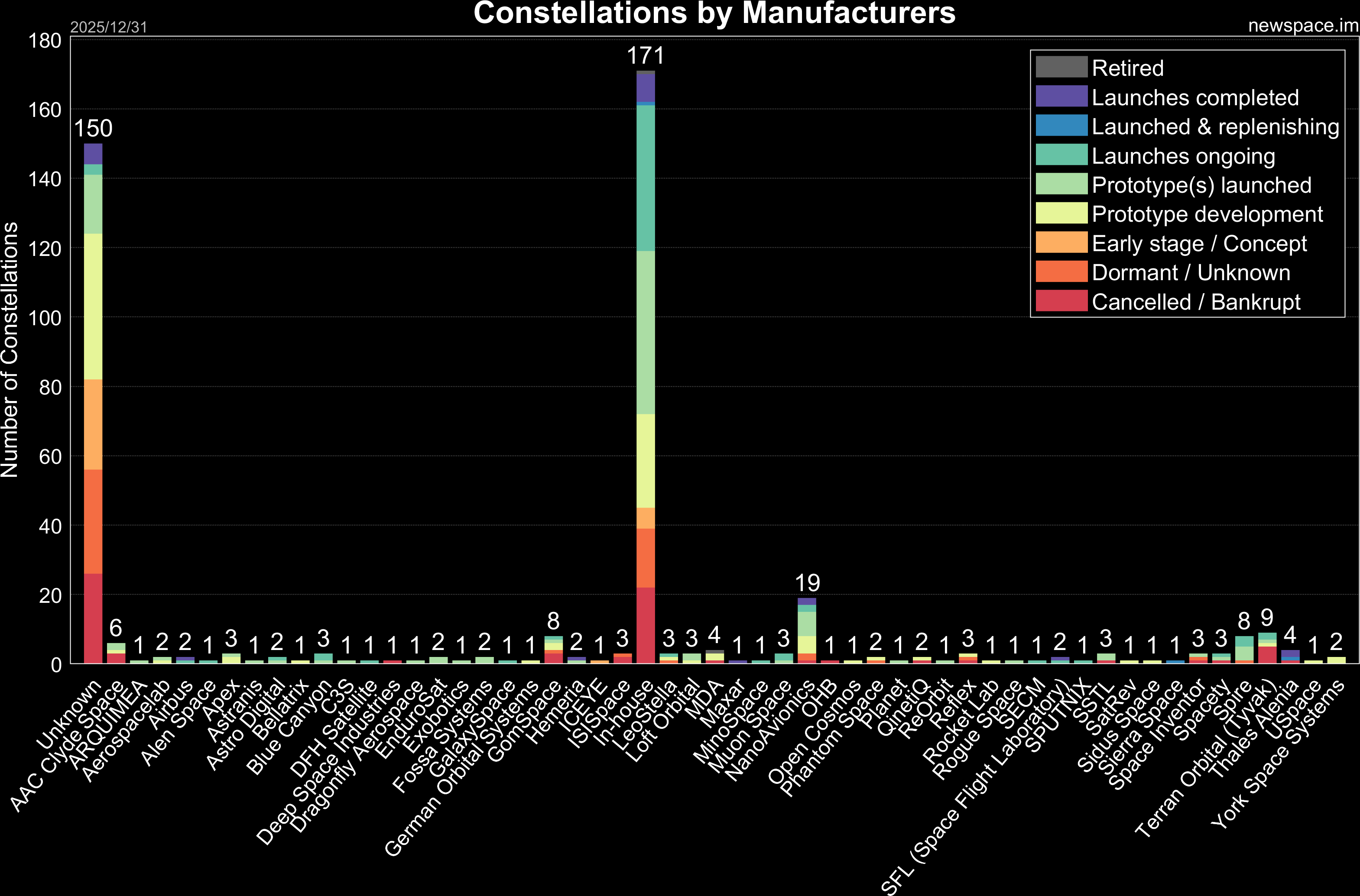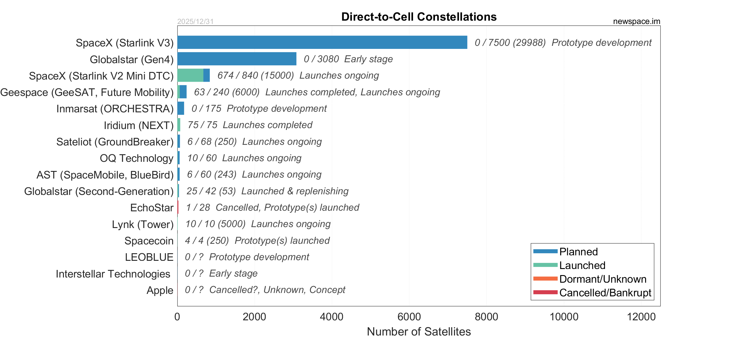 Launches ongoing - Constellation deployment of identical or similar satellites actively in progress or ramping up. Starlink and OneWeb are best examples.