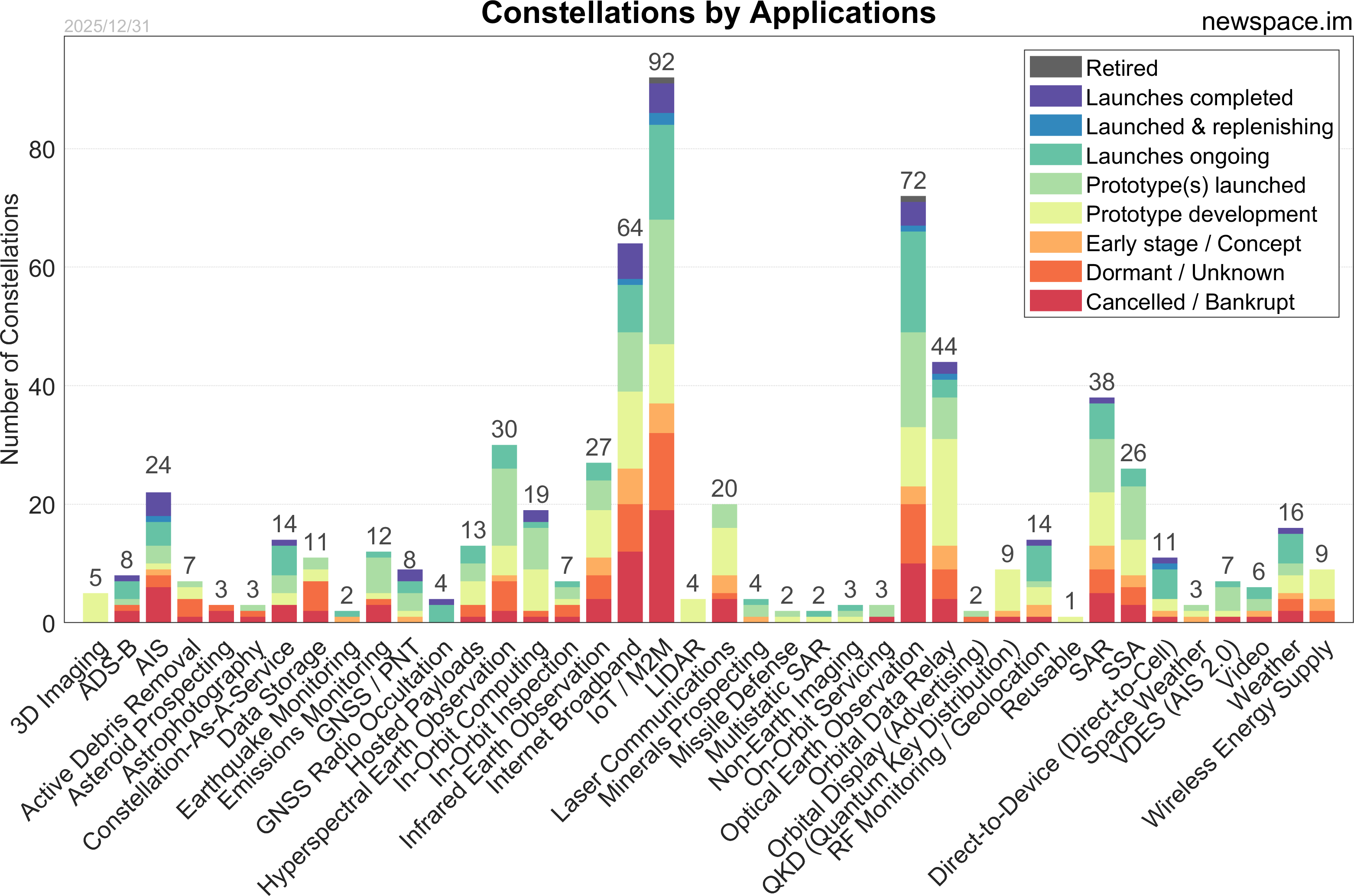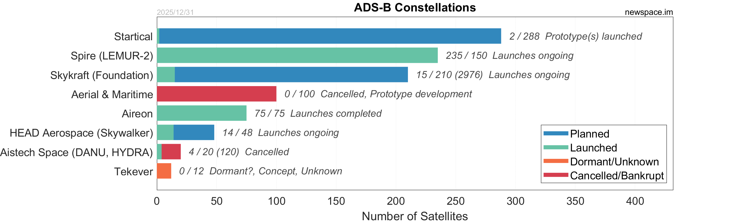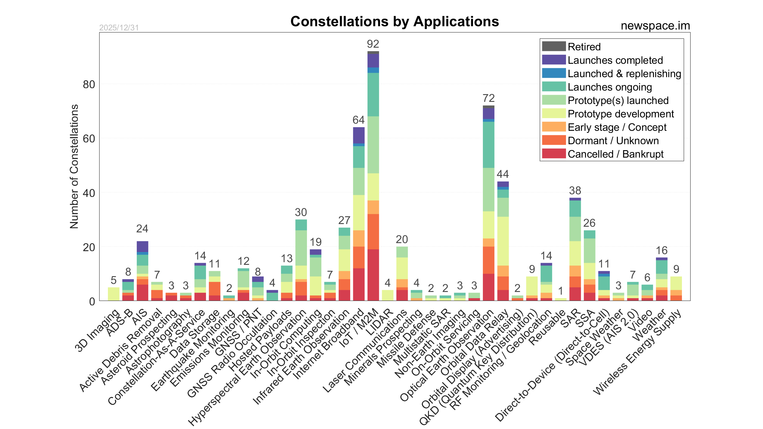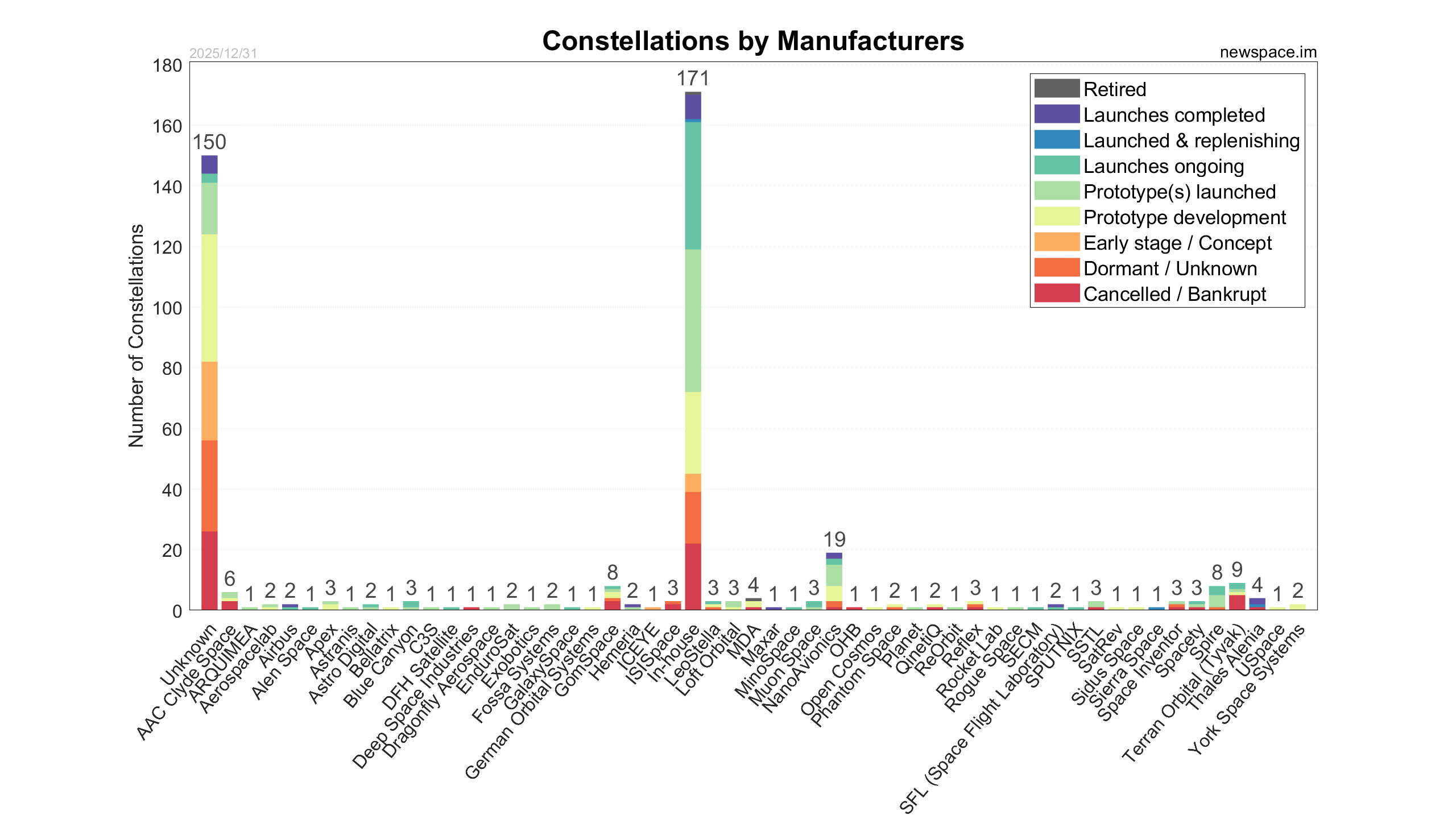 Launches ongoing - Constellation deployment of identical or similar satellites actively in progress or ramping up. Starlink and OneWeb are best examples.