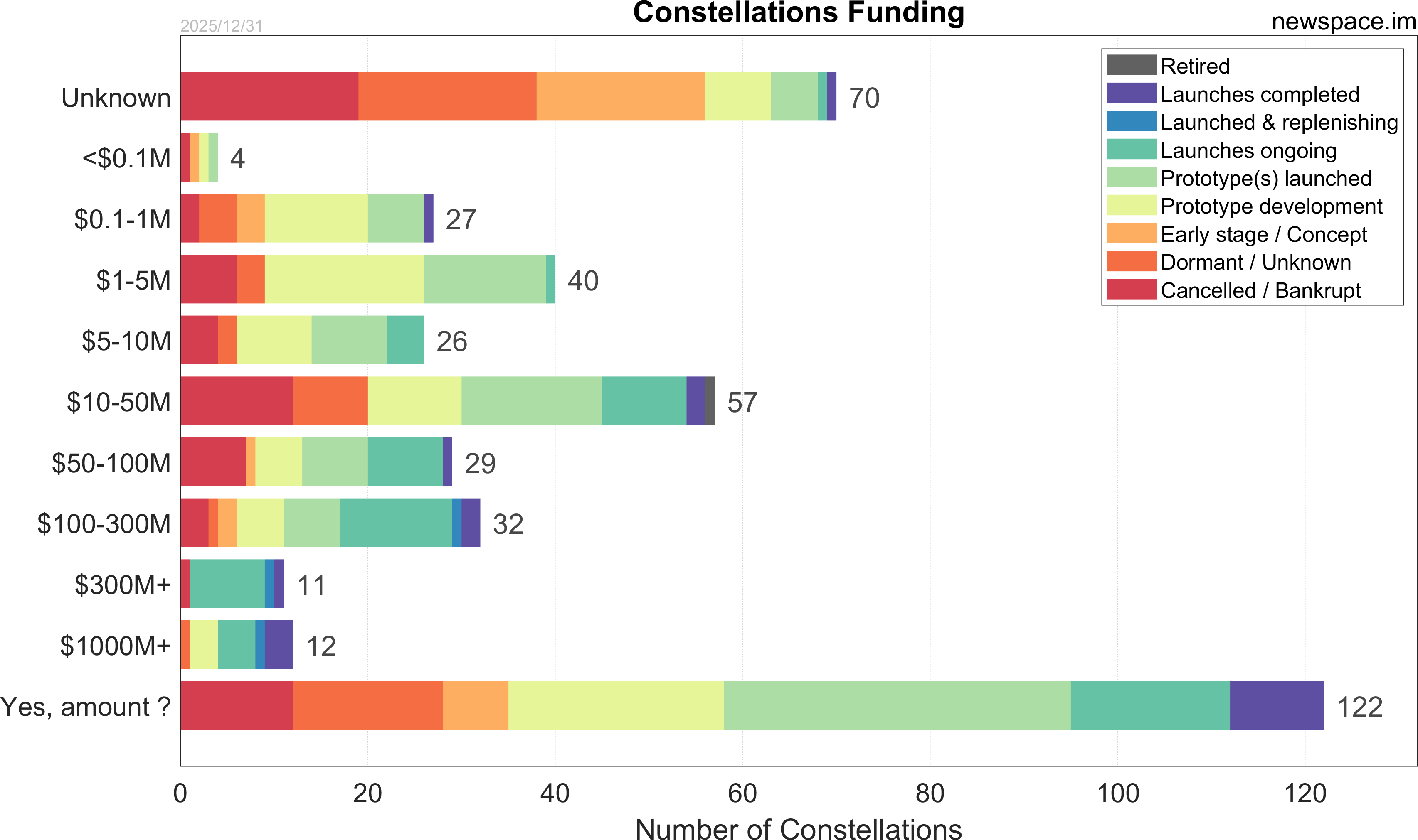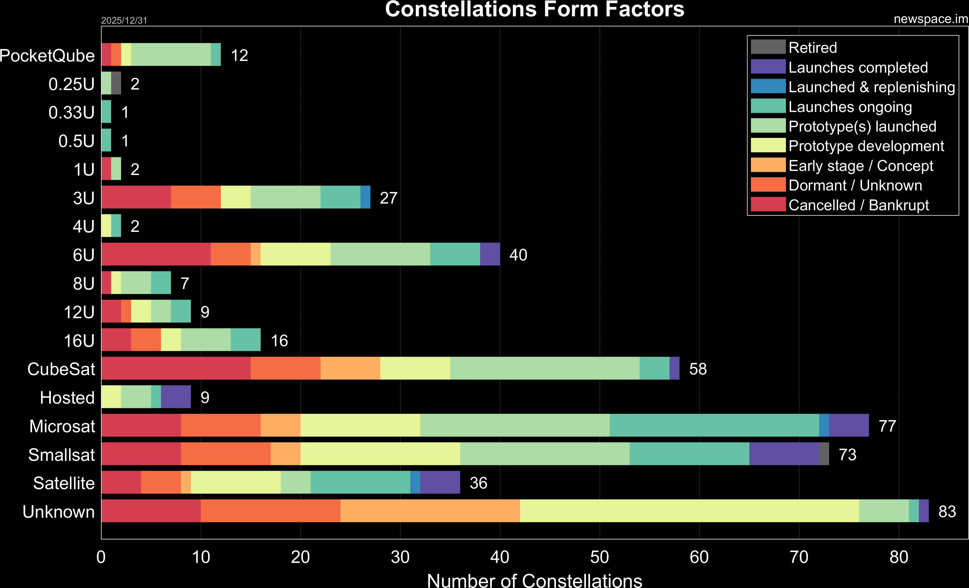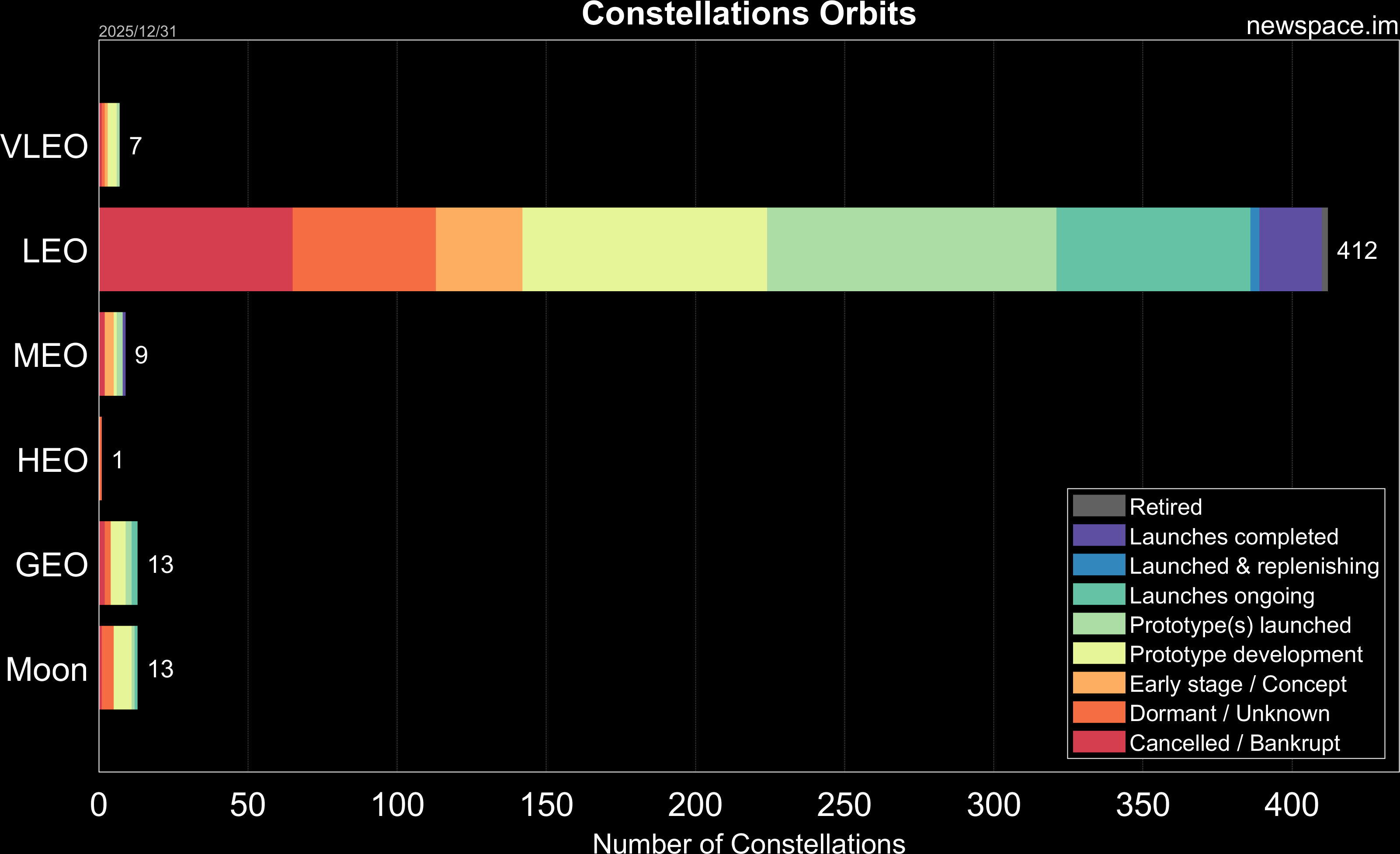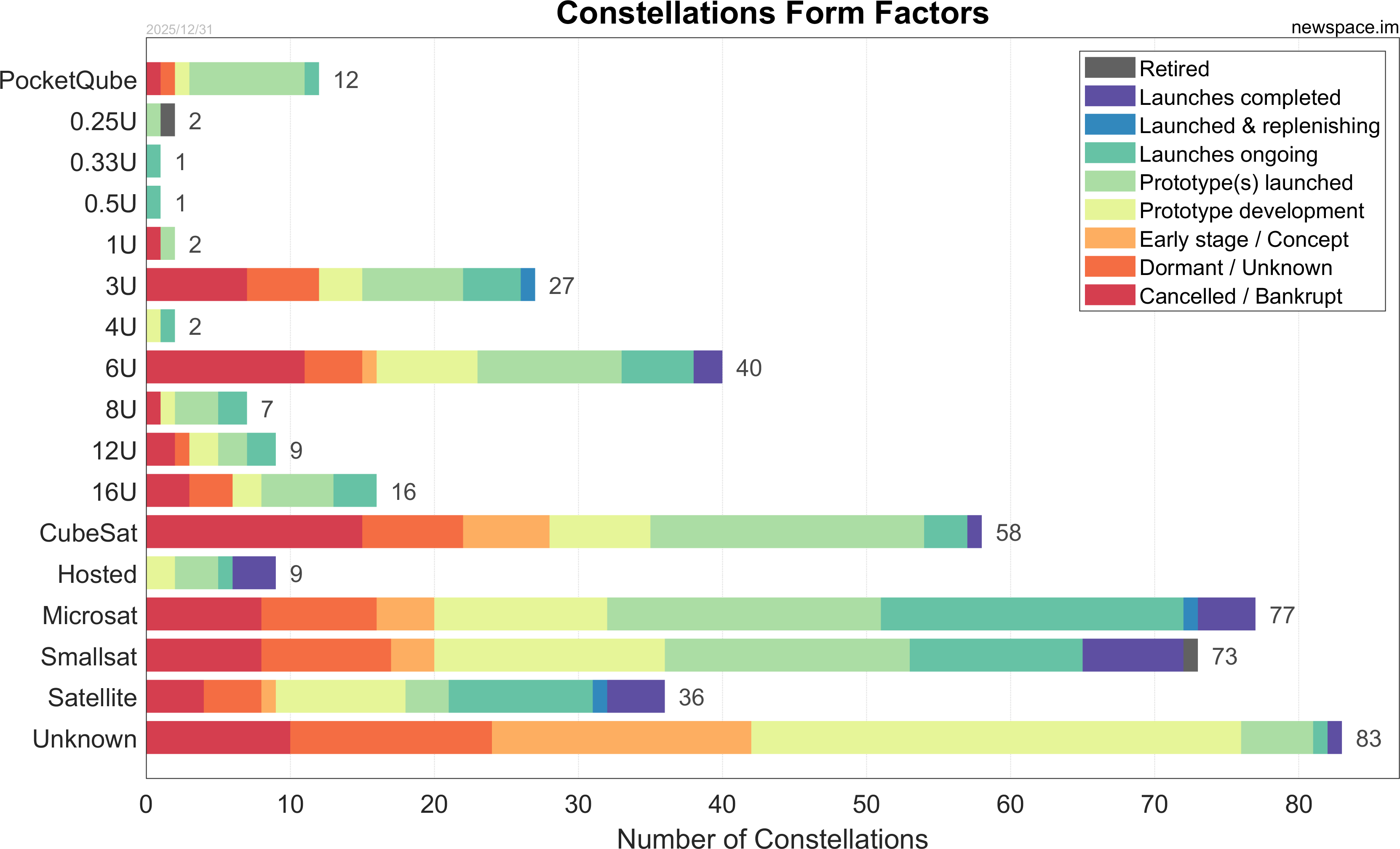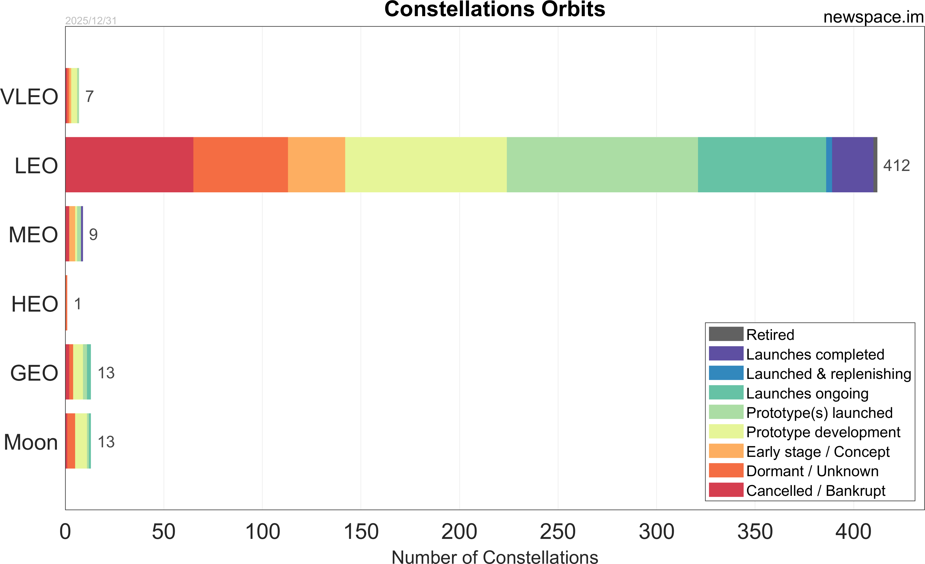 Launches ongoing - Constellation deployment of identical or similar satellites actively in progress or ramping up. Starlink and OneWeb are best examples.