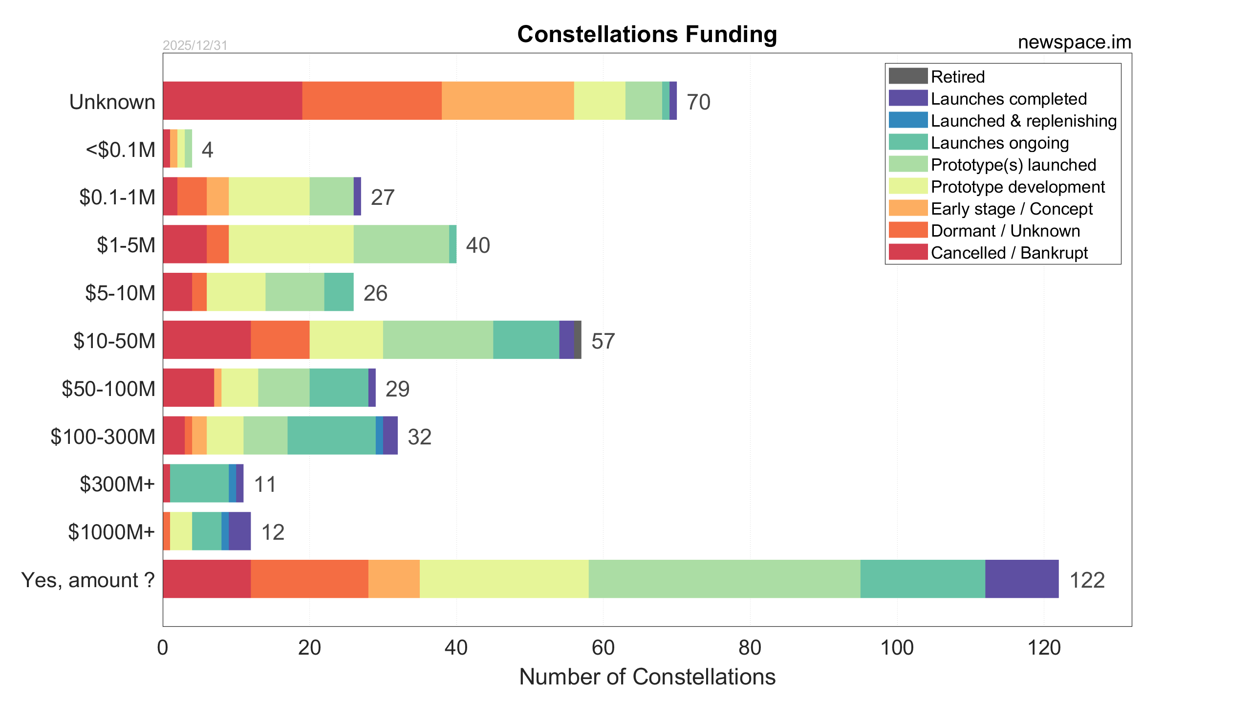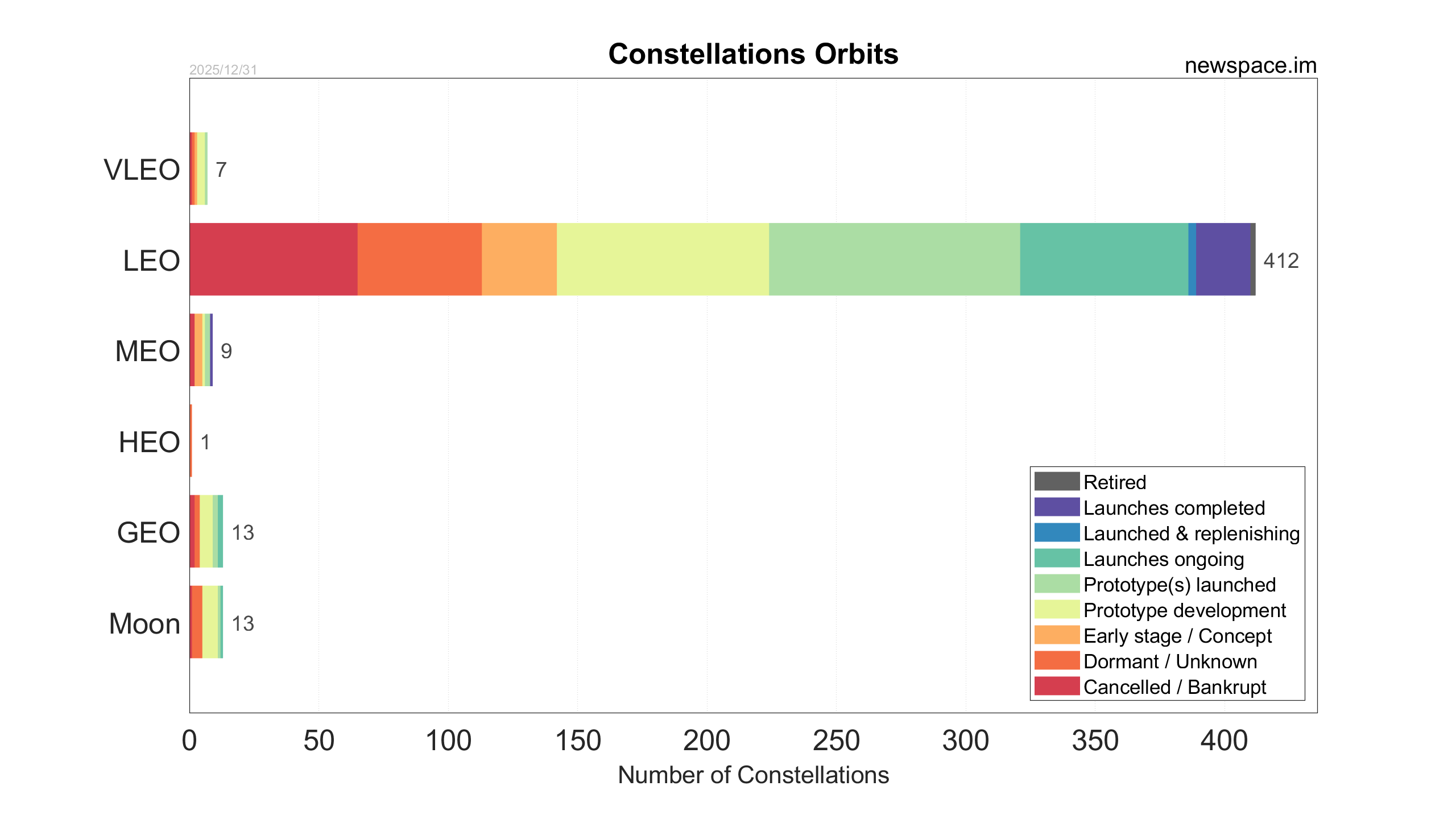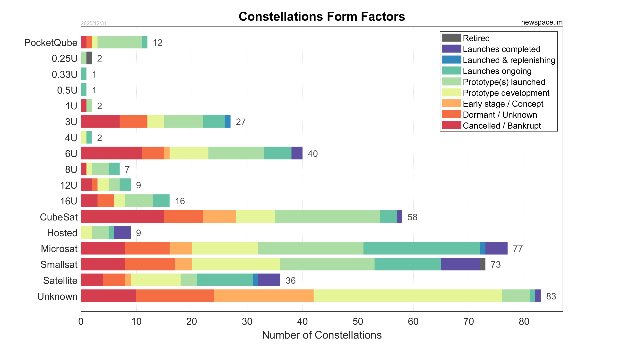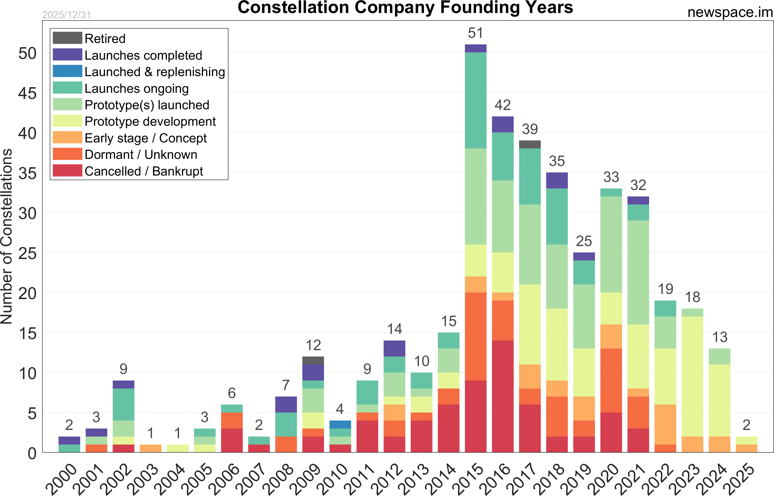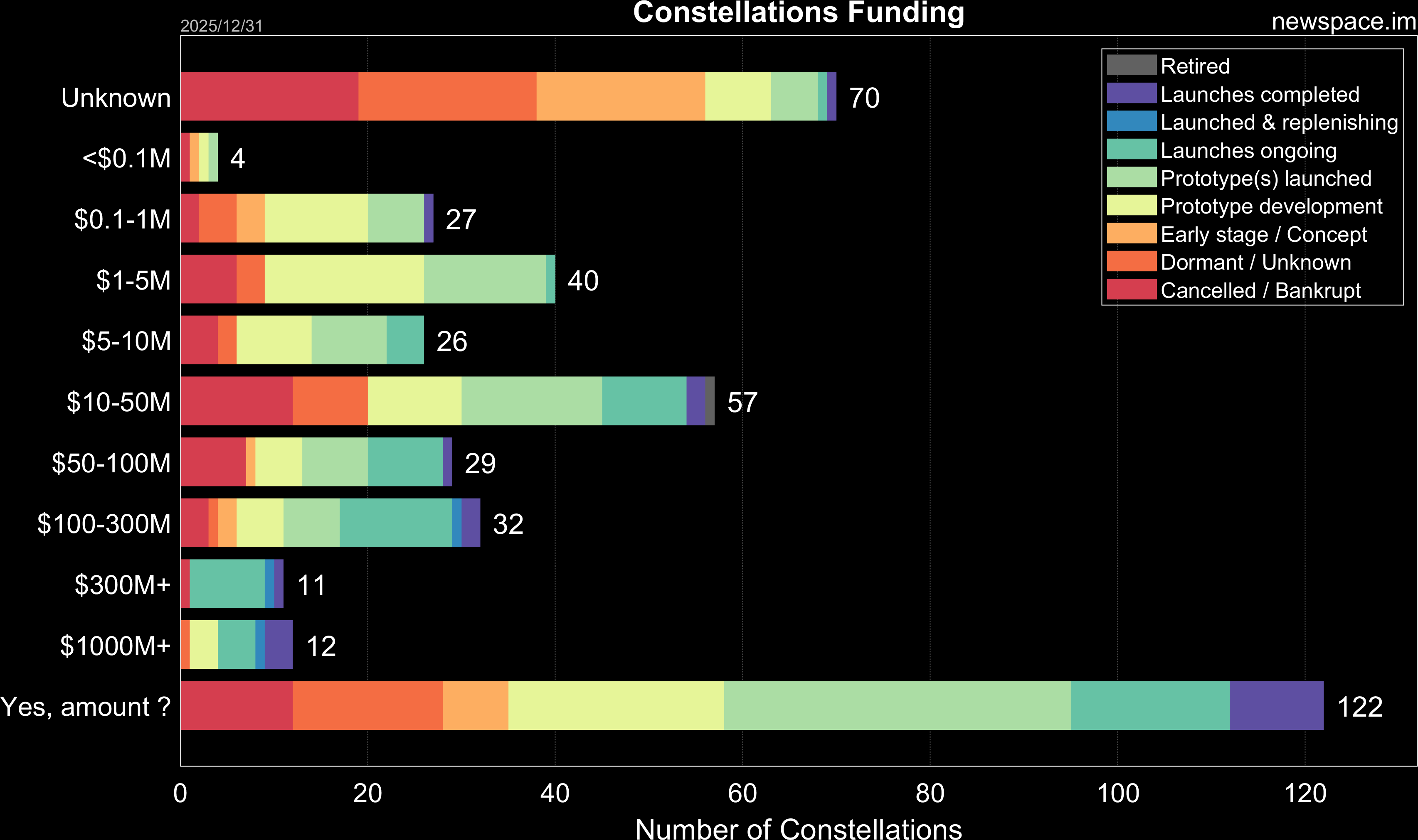 Launches ongoing - Constellation deployment of identical or similar satellites actively in progress or ramping up. Starlink and OneWeb are best examples.