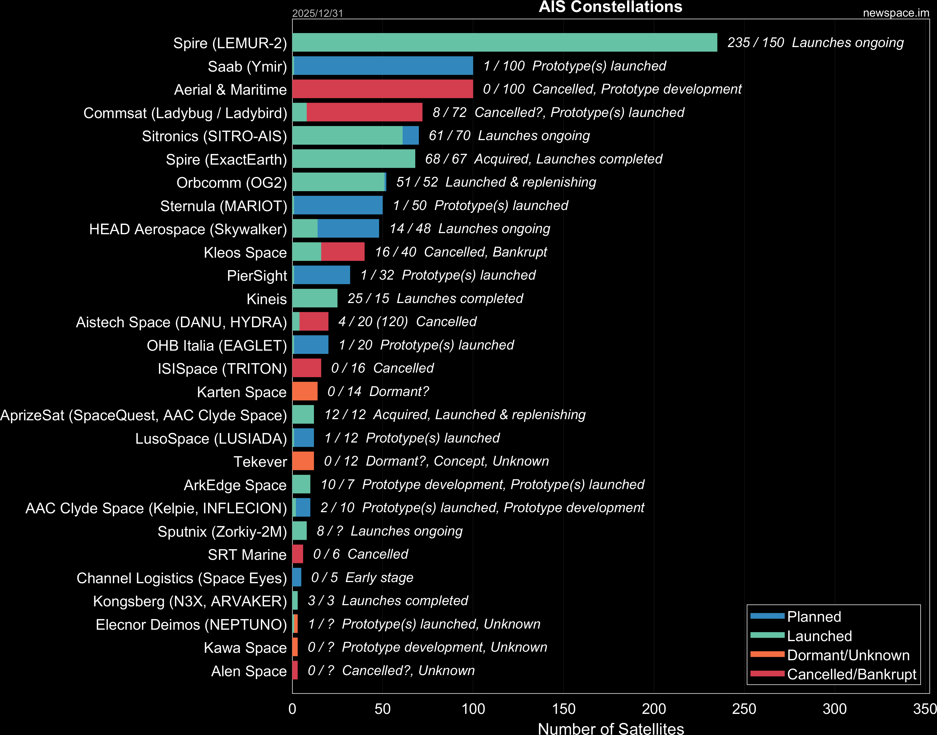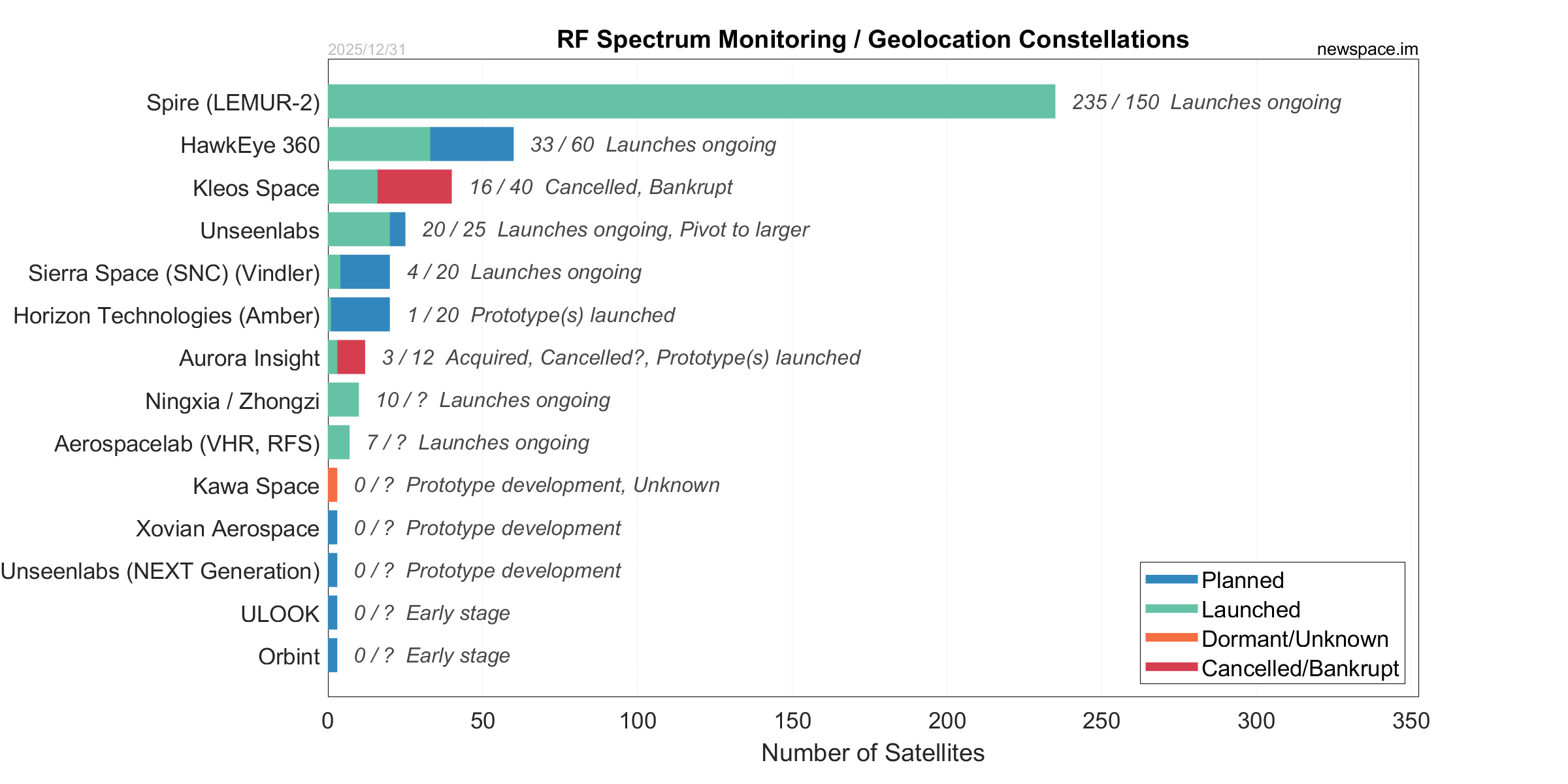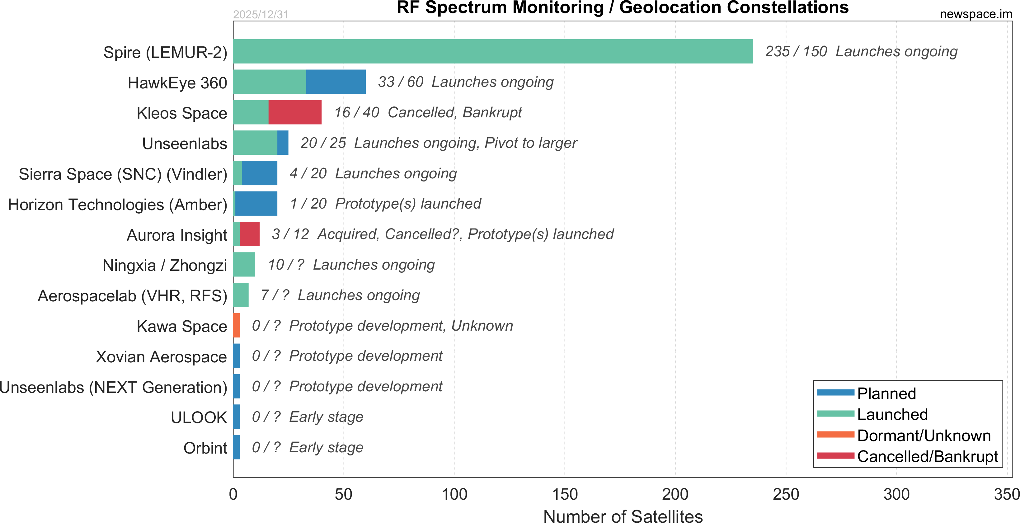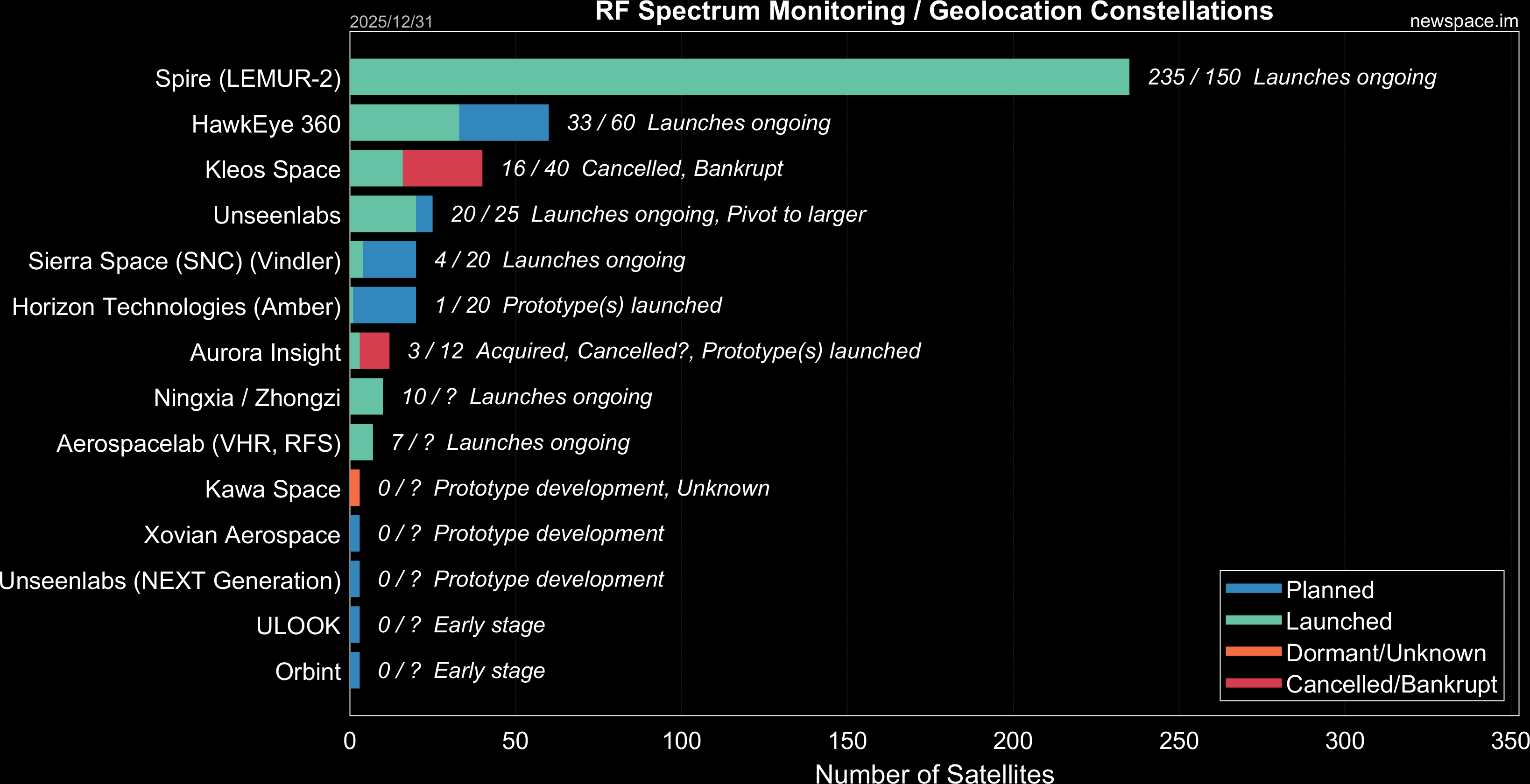 | Kleos Space | 16 / 40 | Cancelled | CubeSat | AIS, RF Geolocation, RF Spectrum Monitoring, SIGINT | $33M+ | |