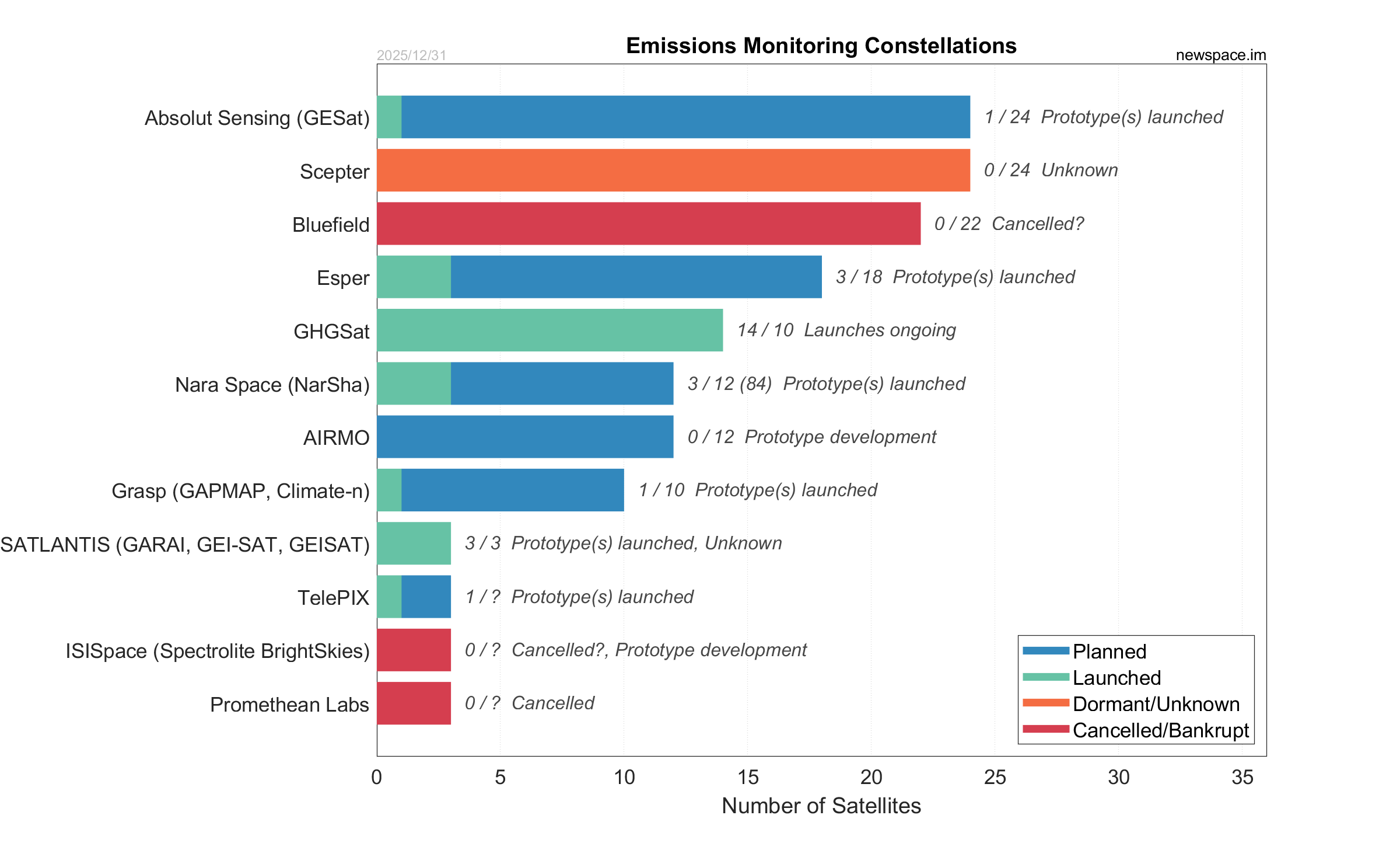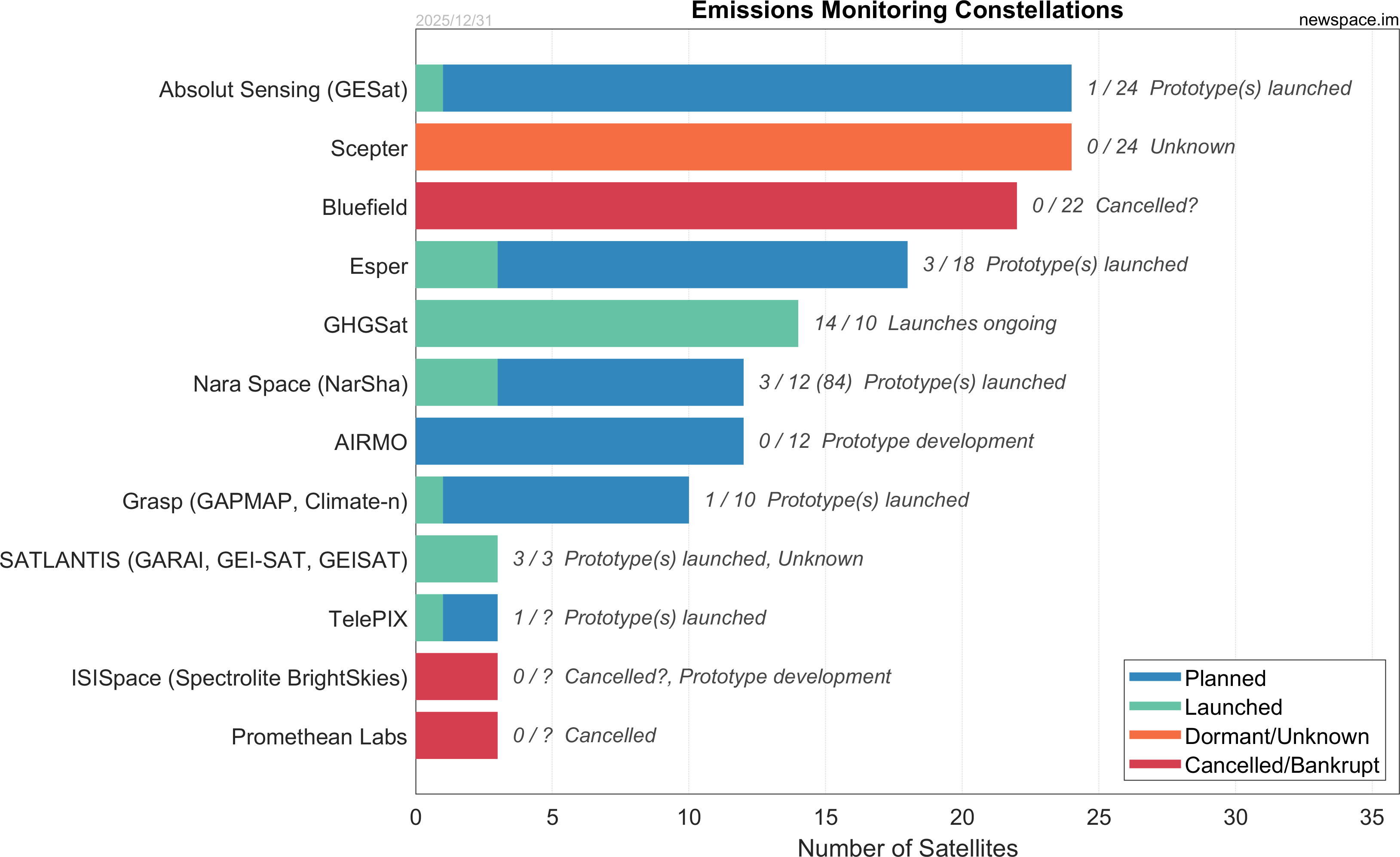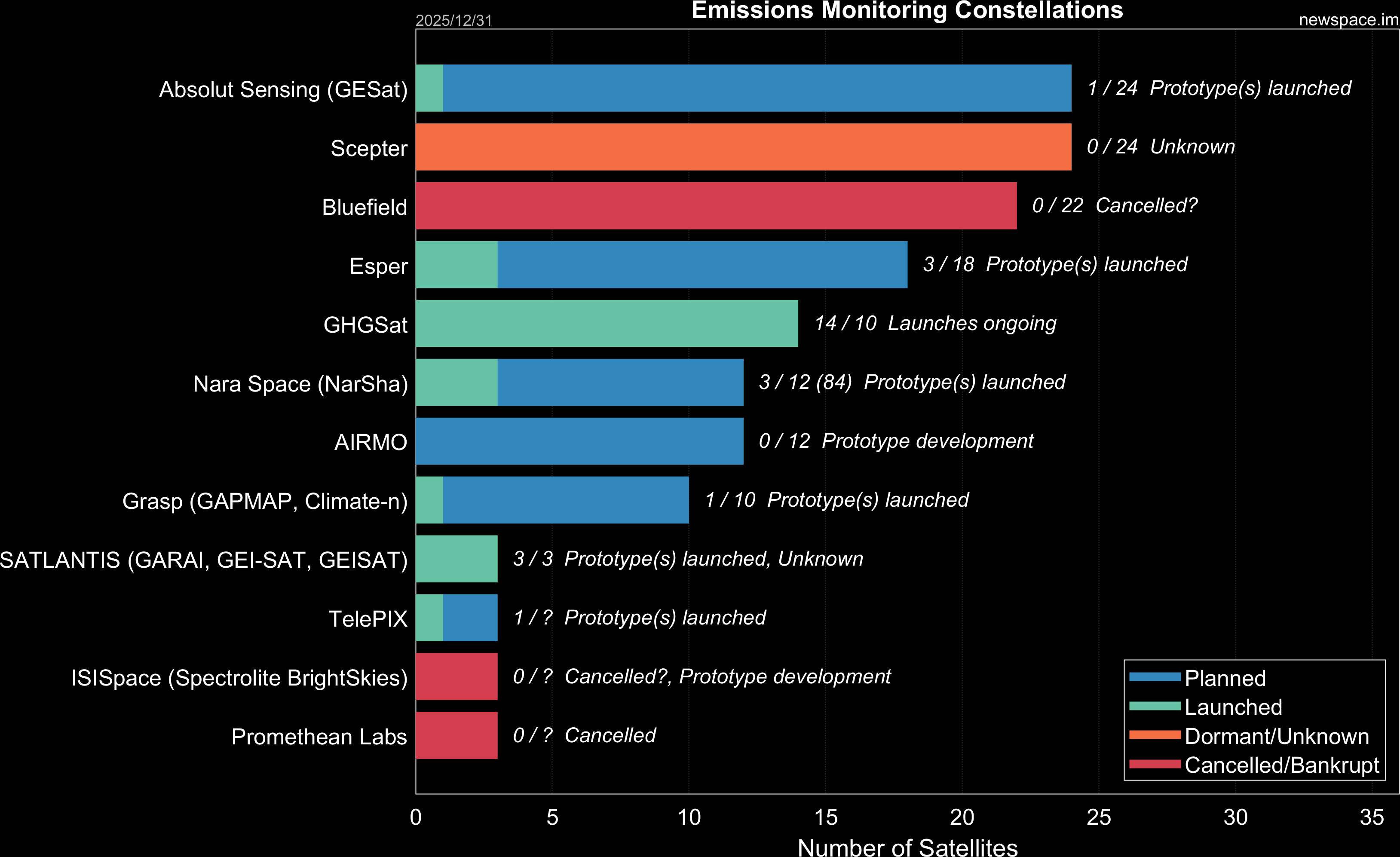 | ISISpace (Spectrolite BrightSkies) | 0 / ? | Cancelled | 12U | Emissions Monitoring | N/A | |