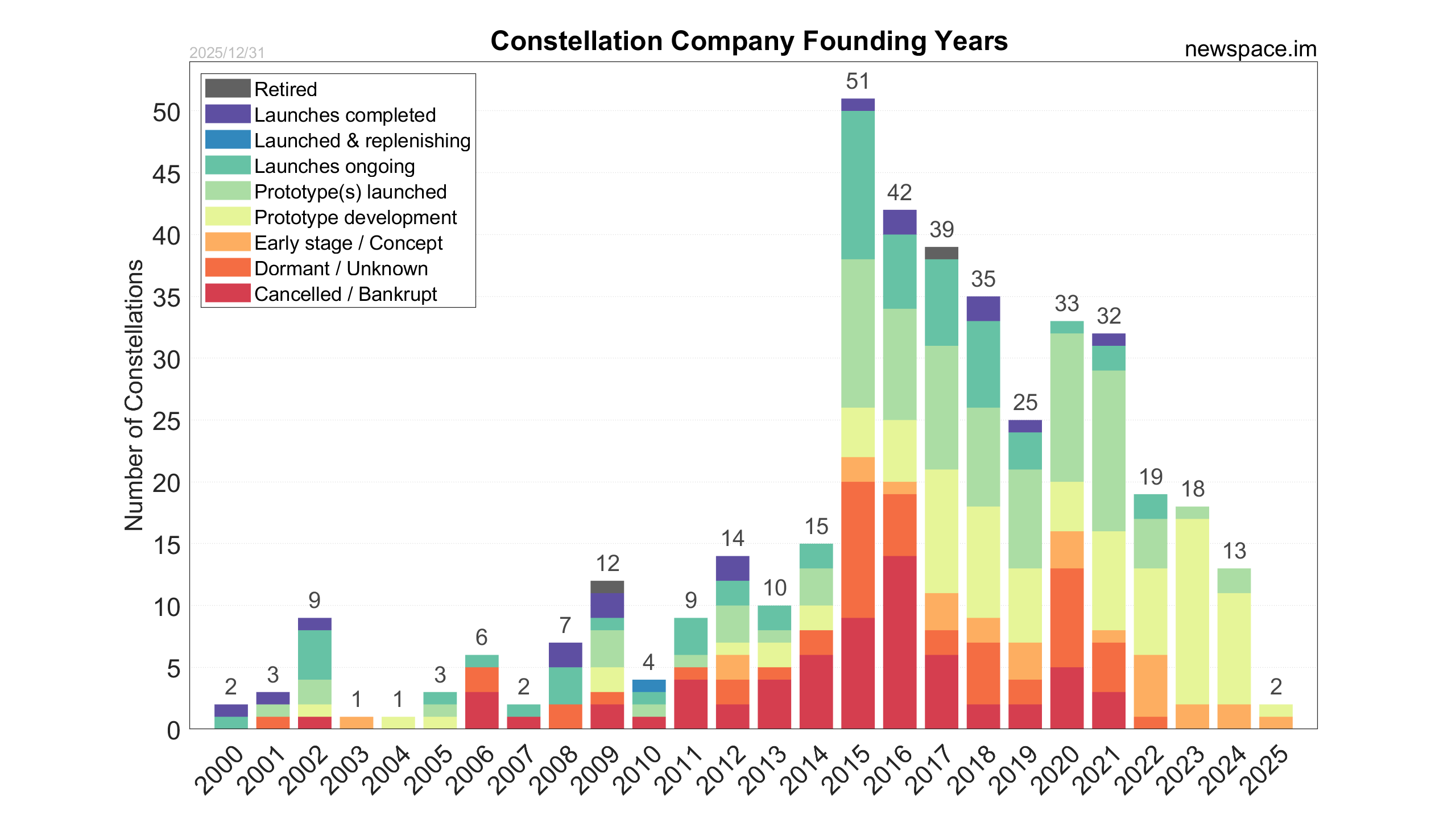 Announced or launched after 2002 - Filtering out the first-generation constellations for Iridium, Globalstar and Orbcomm as of now, in addition to other projects from the 1990s.