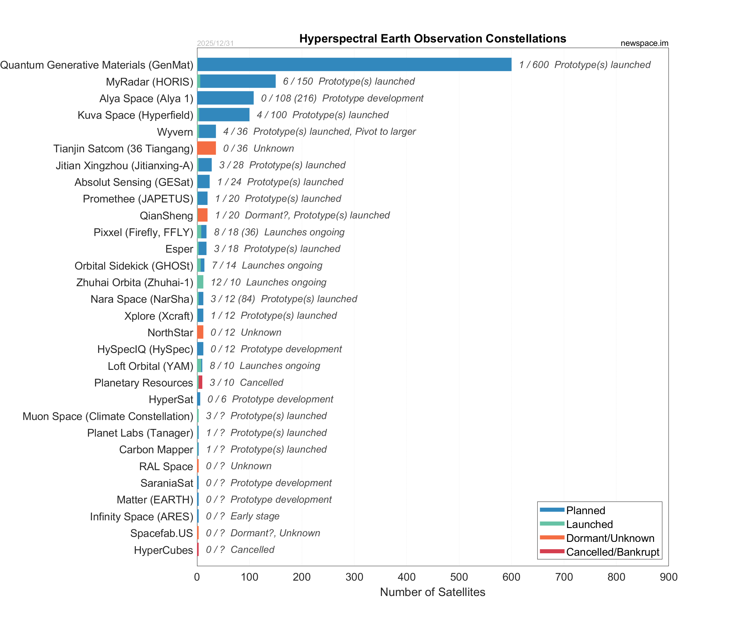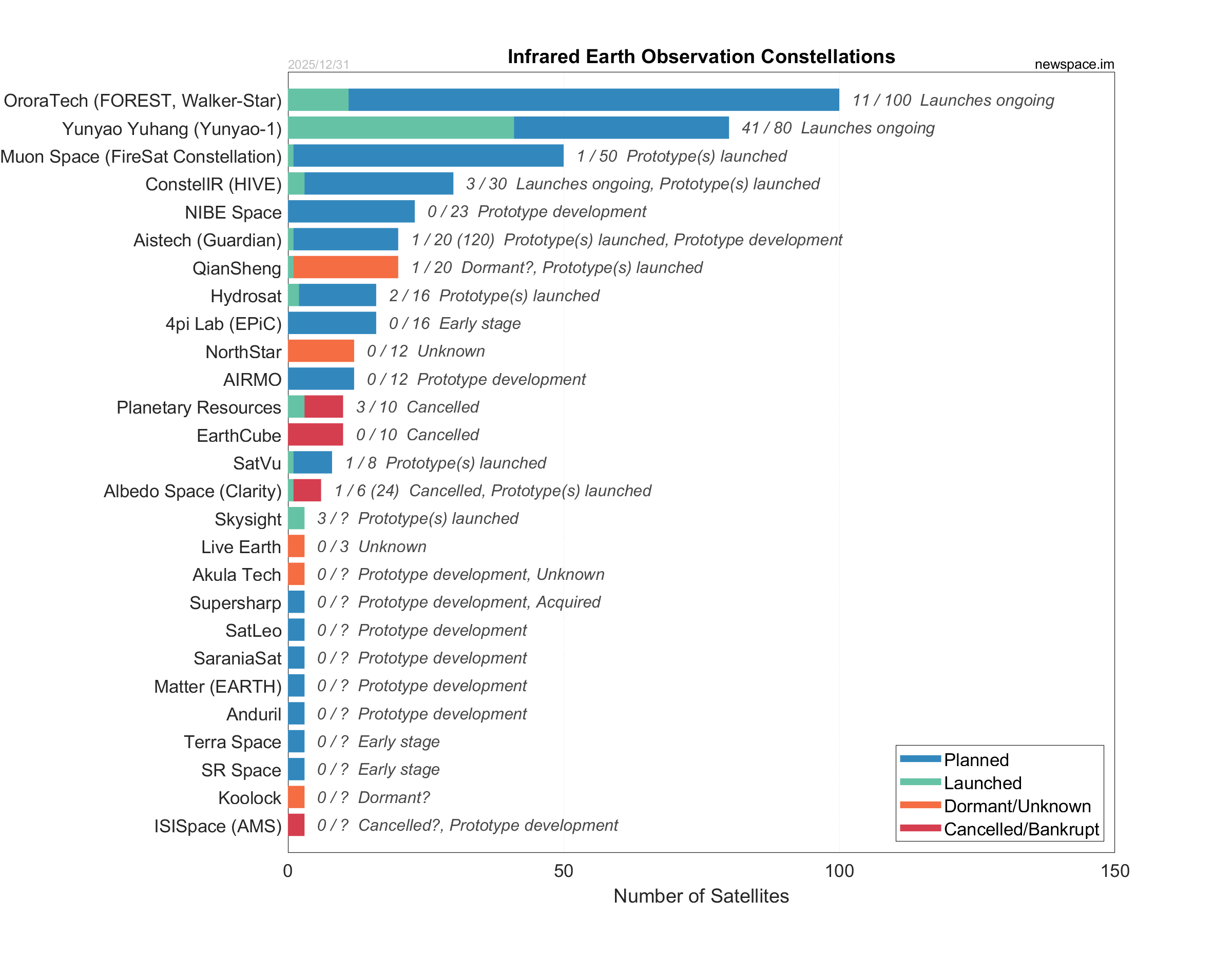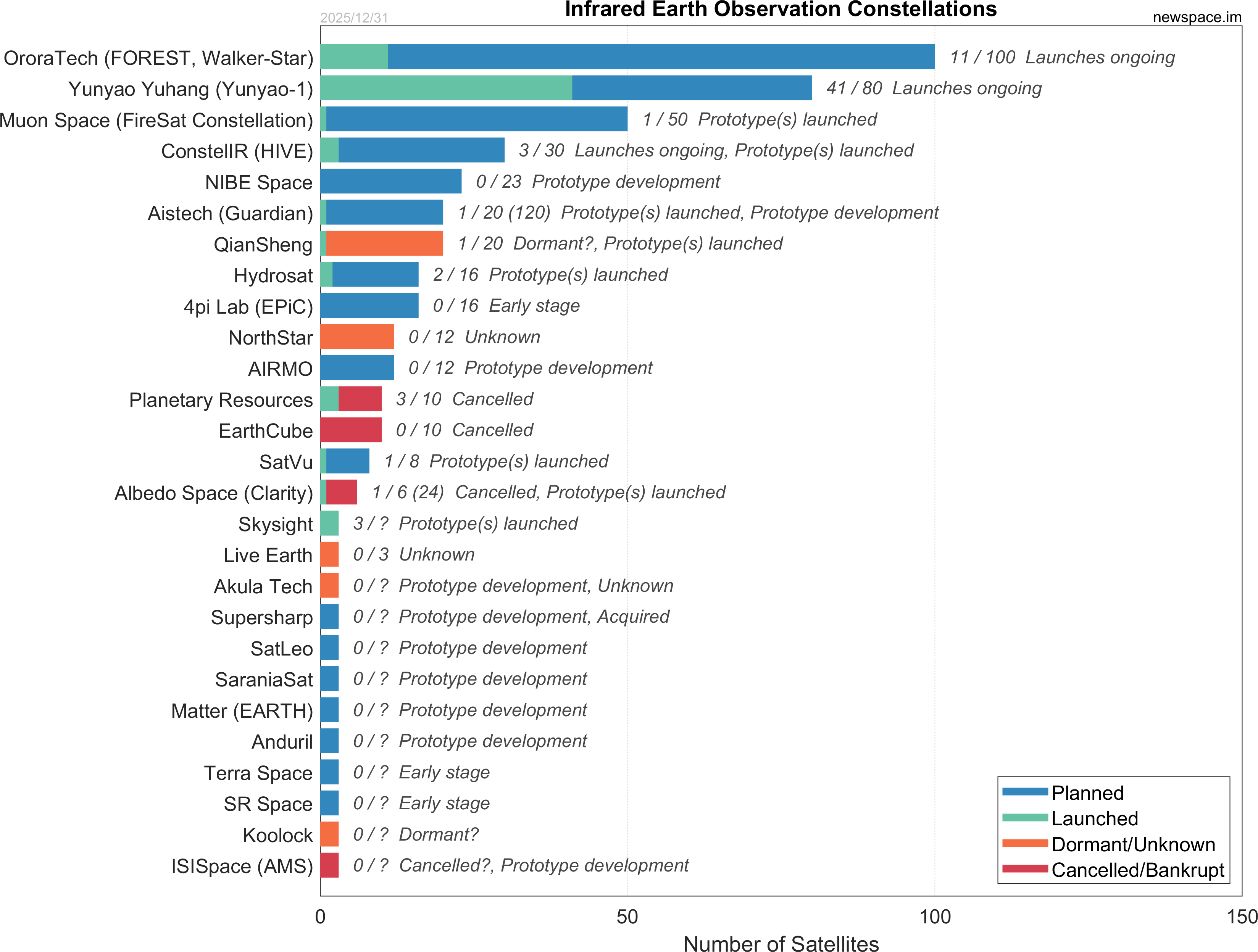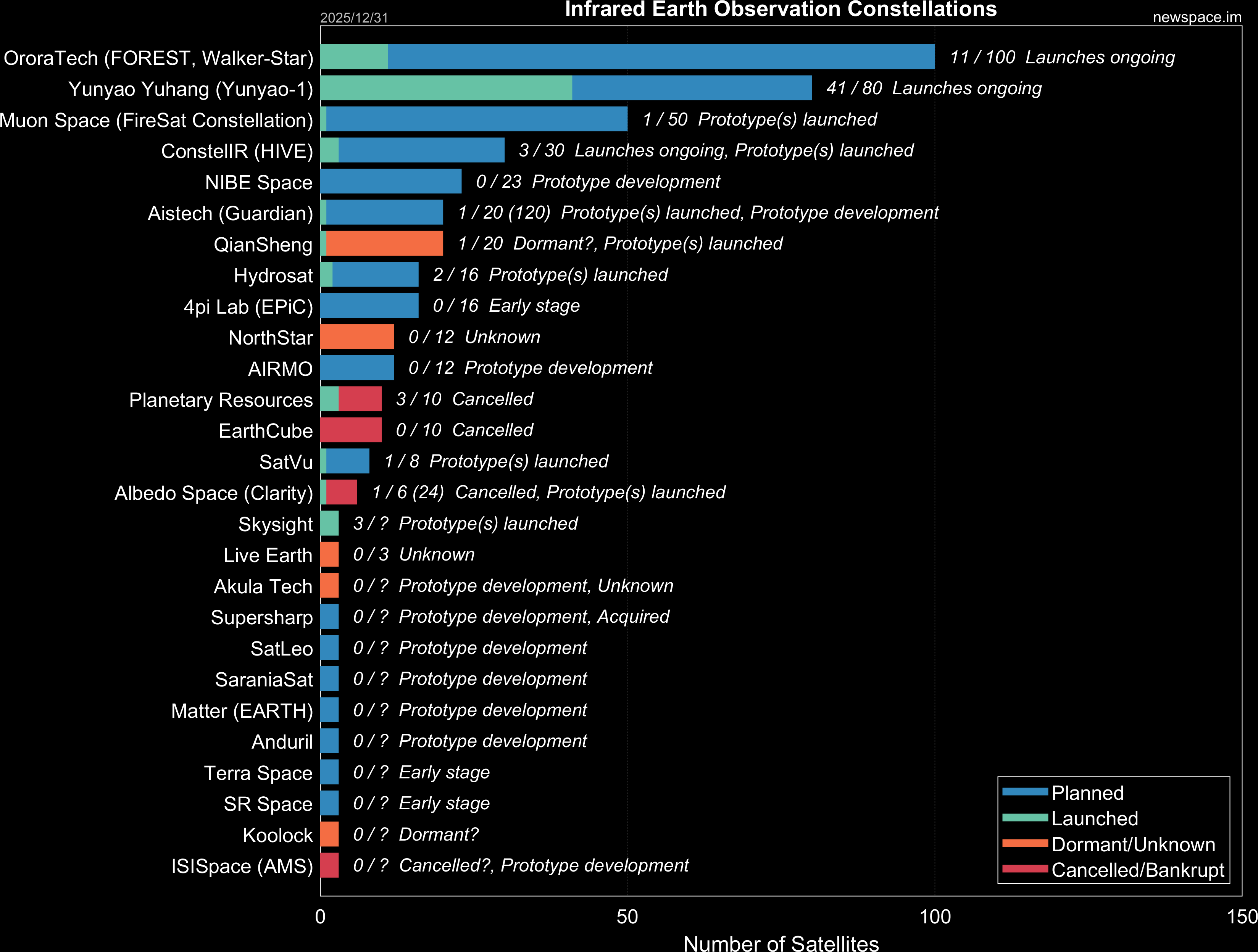 | Planetary Resources | 3 / 10 | Cancelled | 12U | Earth Observation, Infrared, Hyperspectral, Optical | $50M+ | |