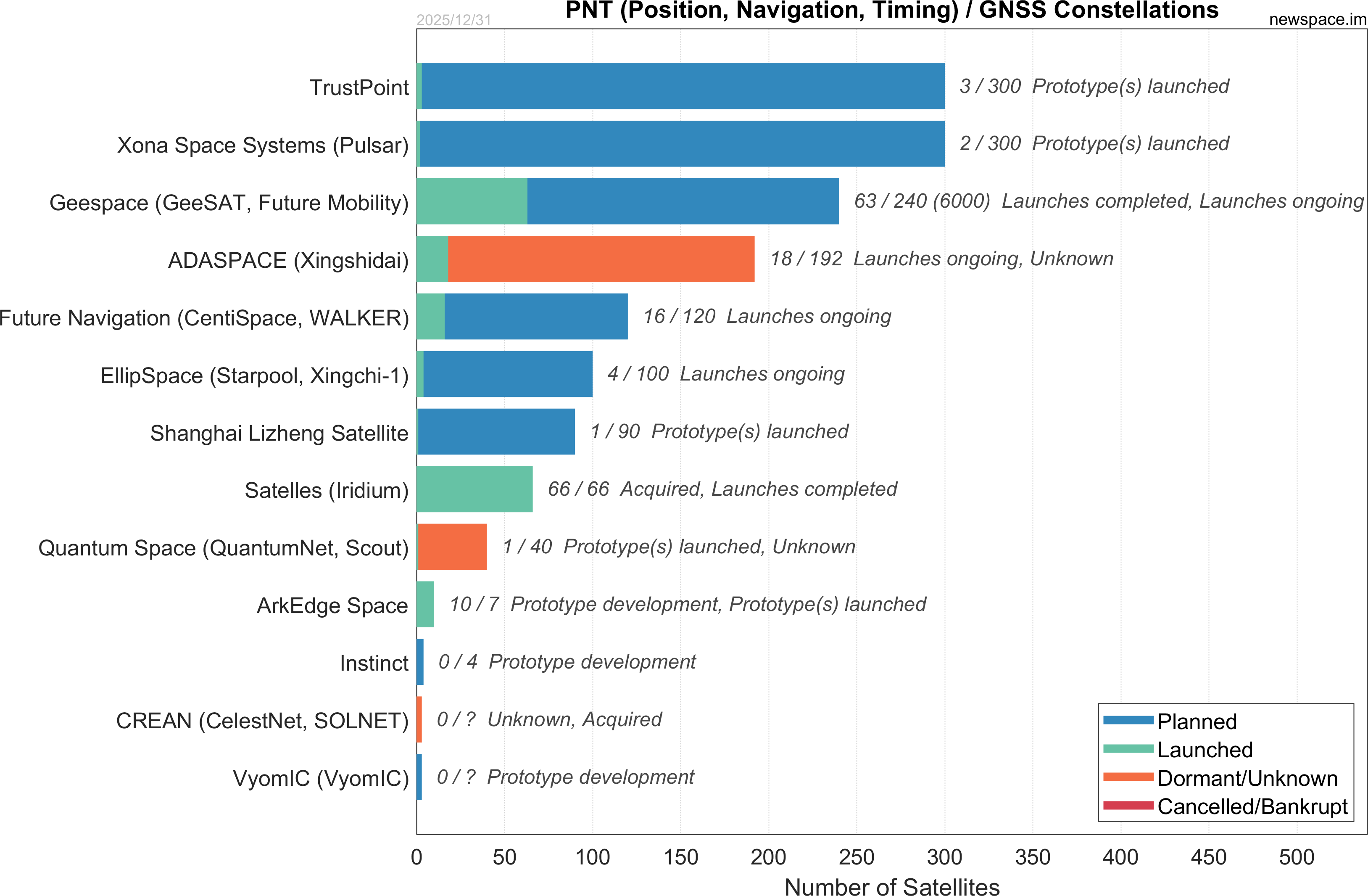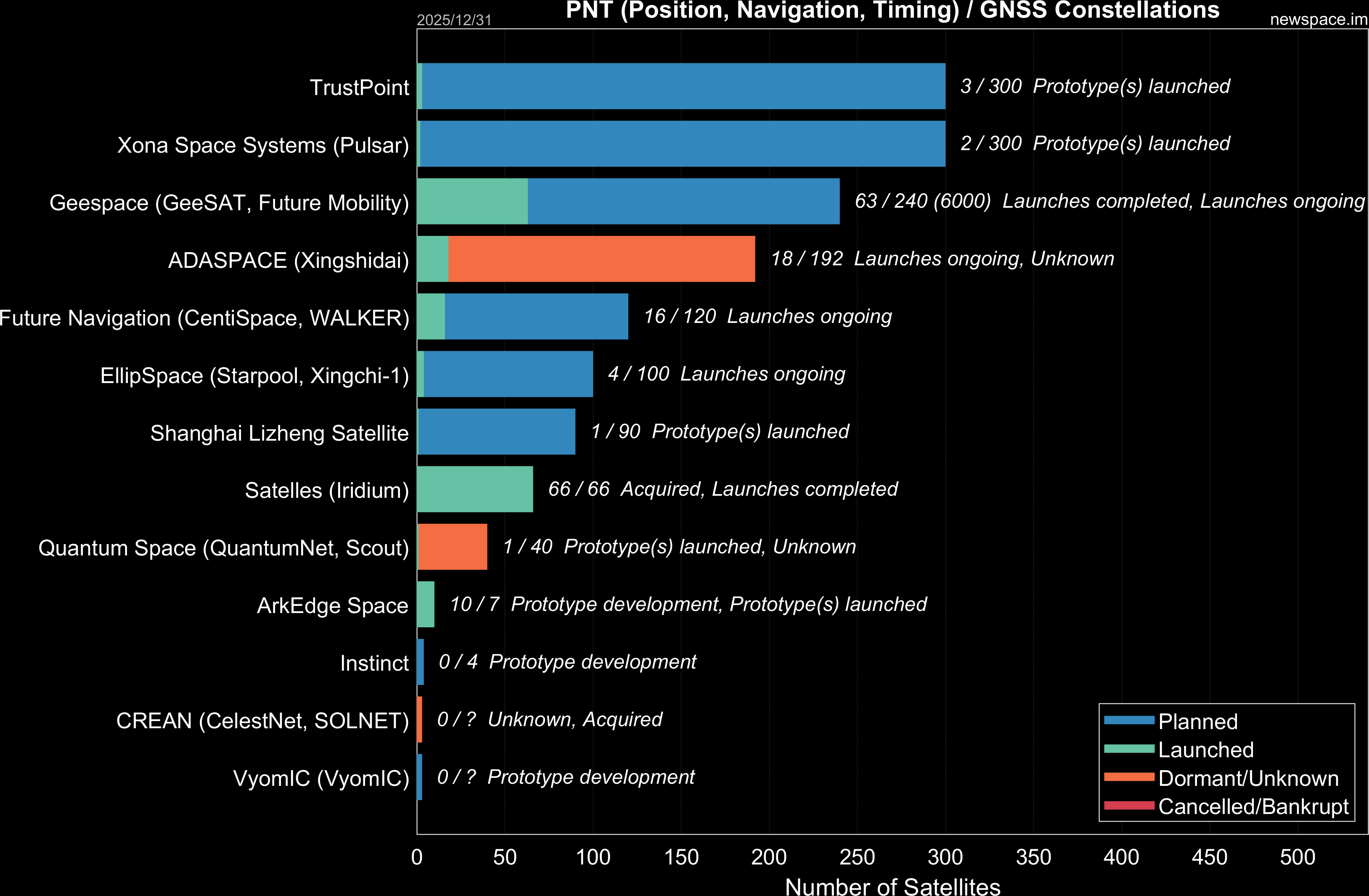 | Satelles (Iridium) | 66 / 66 | 2017 | Satellite | GNSS, PNT (Positioning; Navigation; Timing) | $29.3M | |