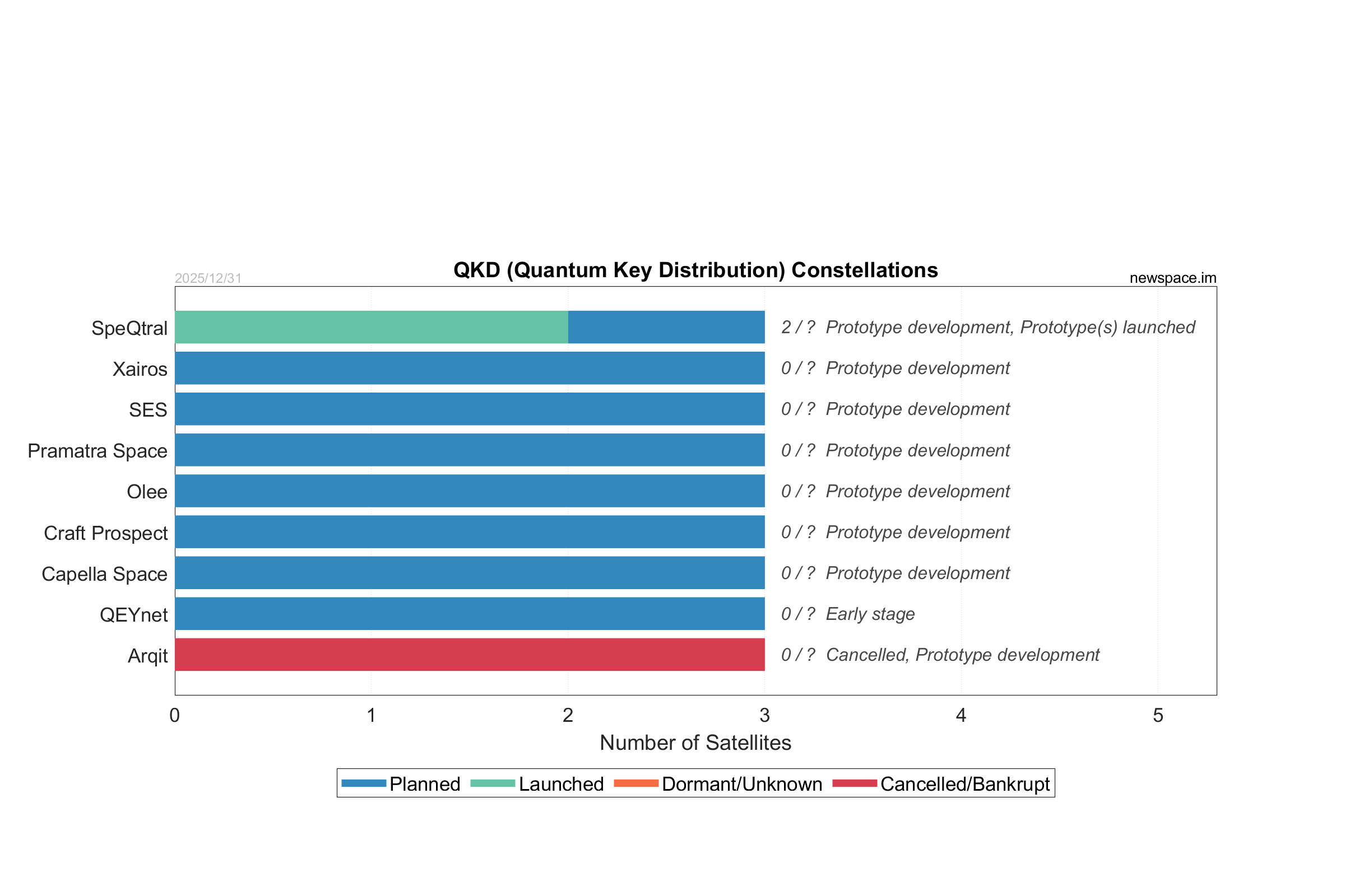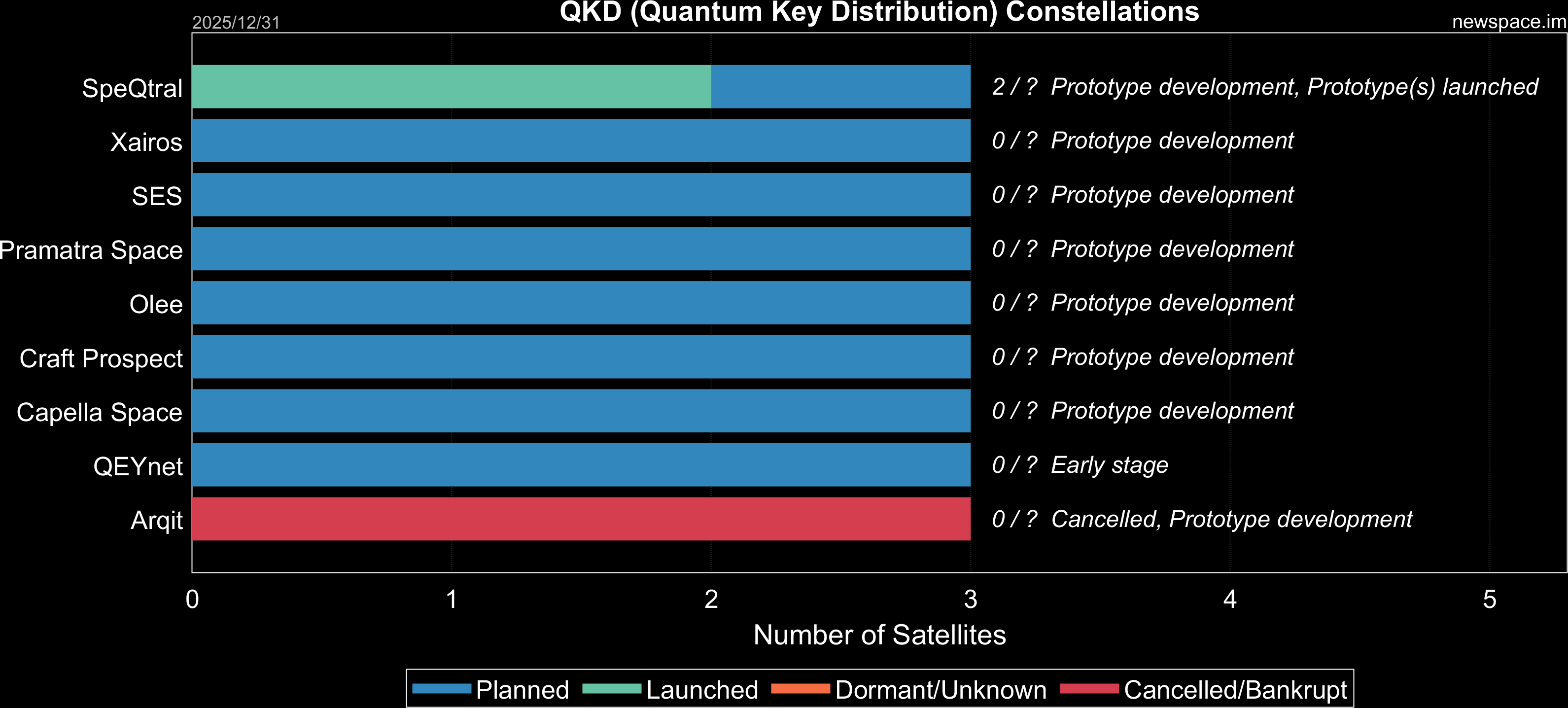 | SpeQtral | 2 / ? | 2019 | CubeSat? | QKD (Quantum Key Distribution), Laser Communications | $10.2M | |