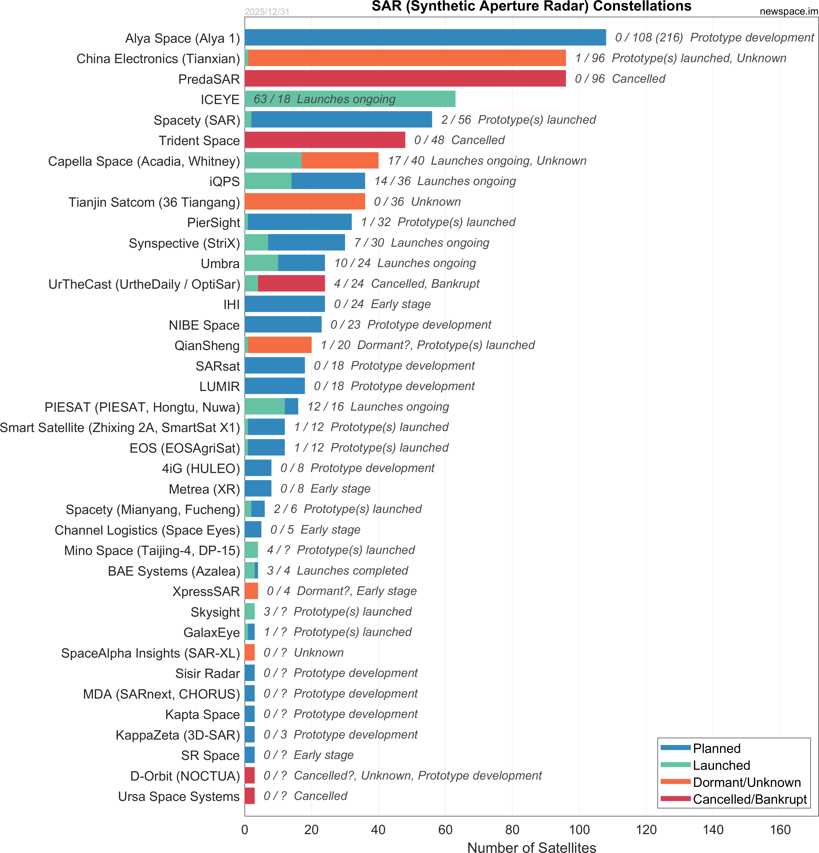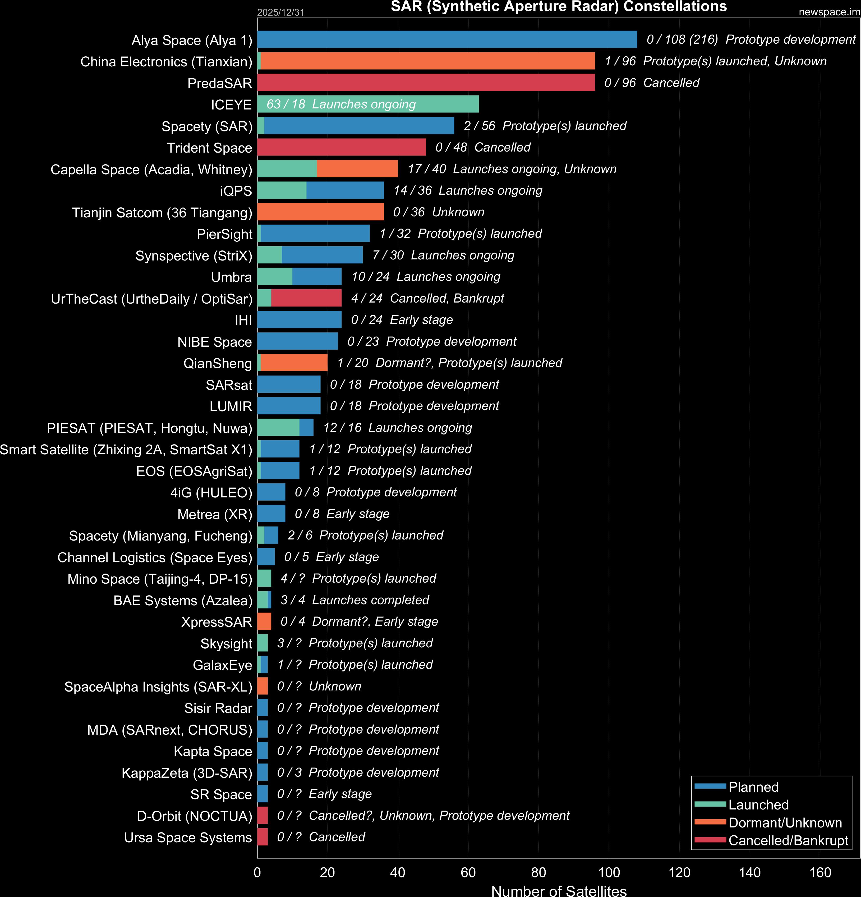 | PredaSAR | 0 / 96 | Cancelled | Smallsat | SAR, Earth Observation | $25M | |