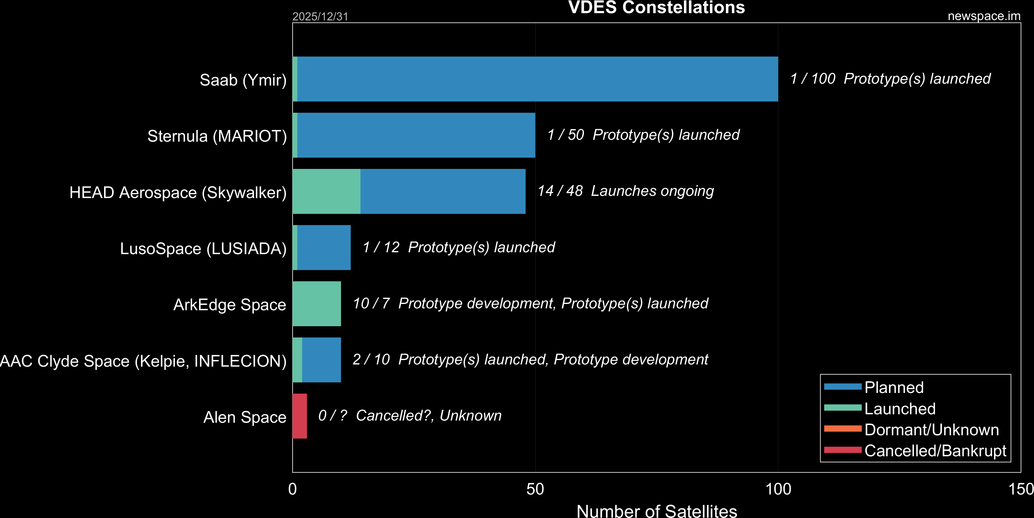 | HEAD Aerospace (Skywalker) | 14 / 48 | 2017 | Microsat | IoT / M2M, AIS, ADS-B, VDES (AIS 2.0) | Yes | |