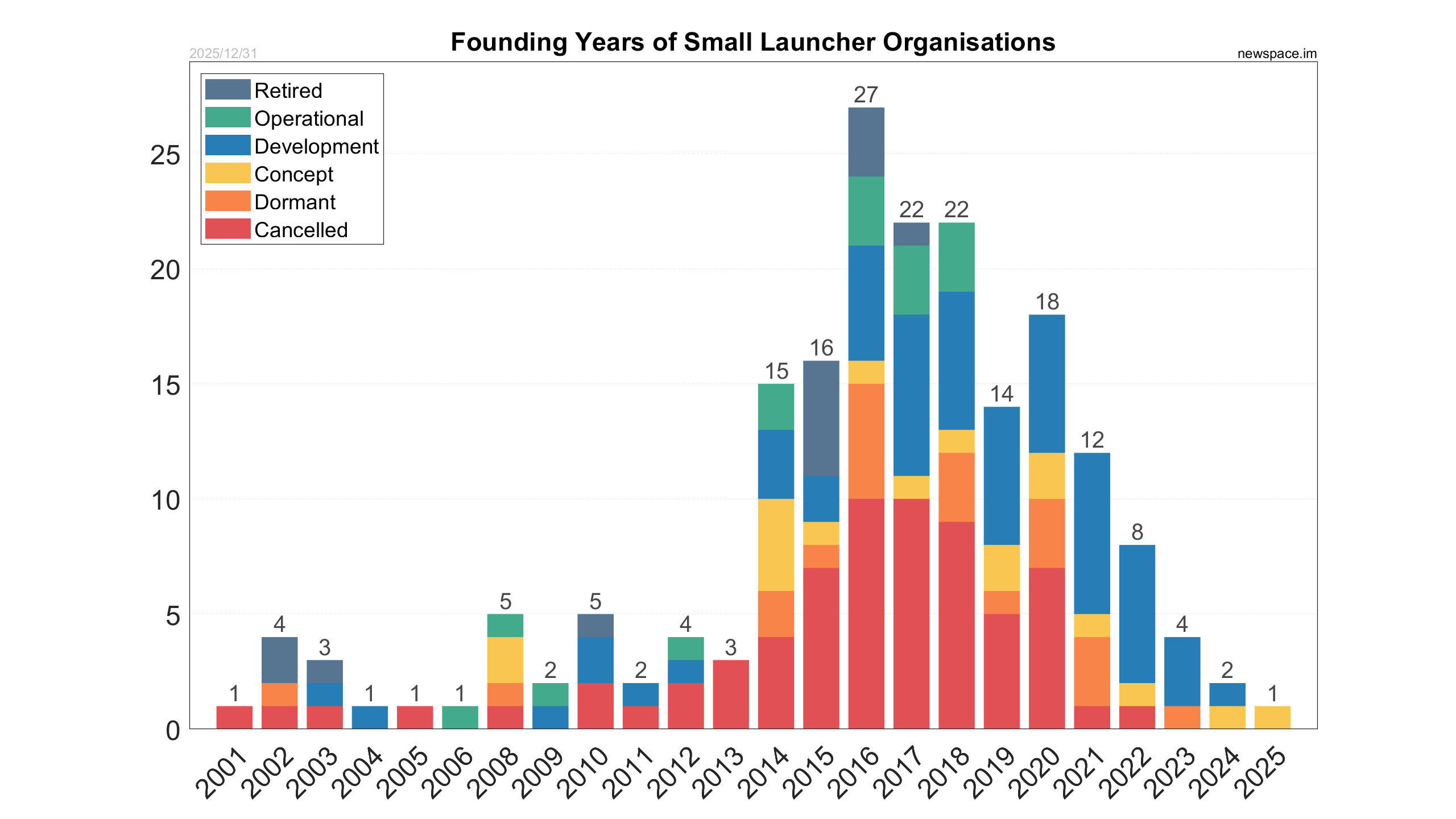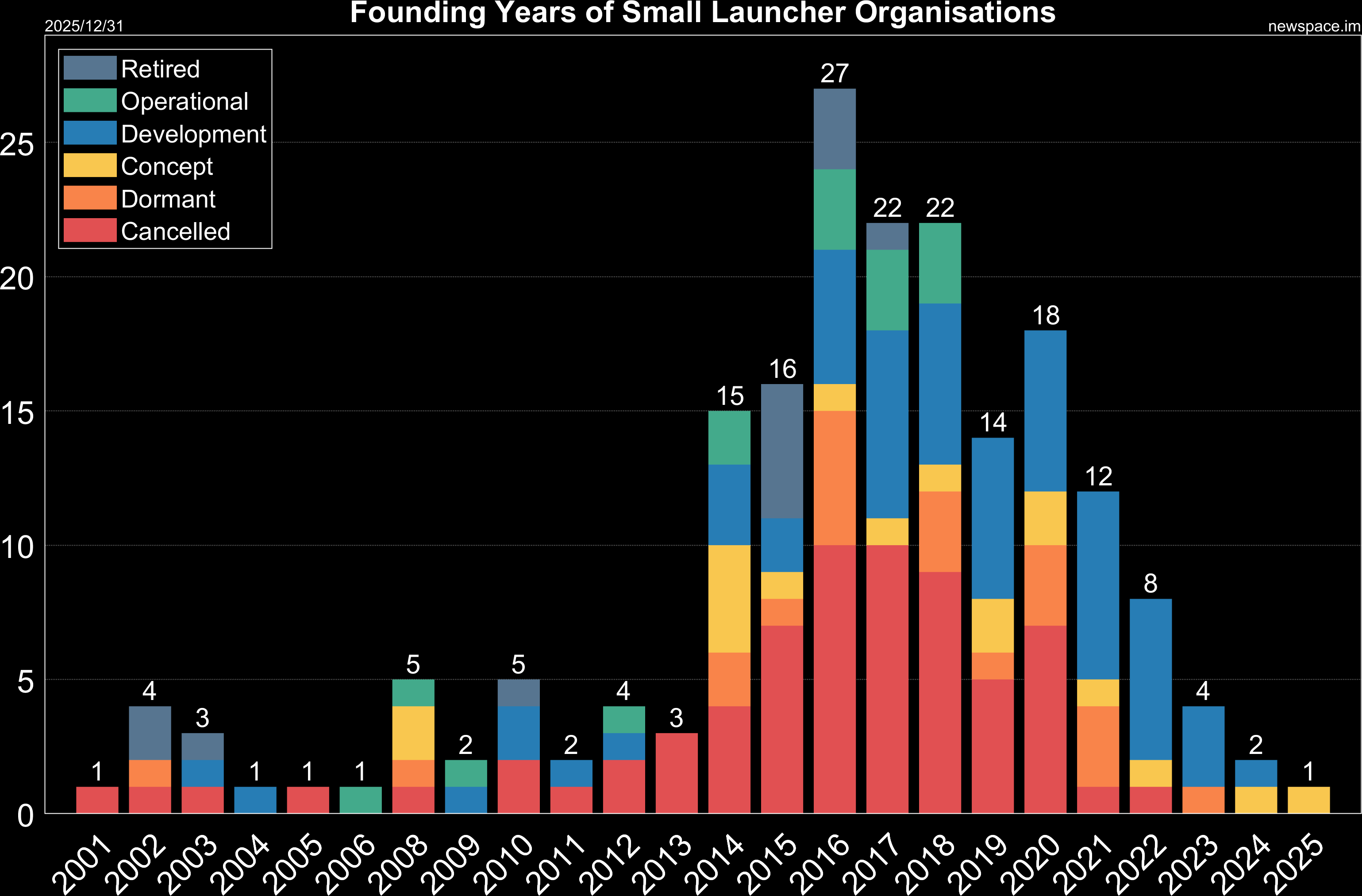 Dormant - First step on the way to Cancelled. Website offline, lack of recent (1+ year) posts on social media channels or only non-related topics, very small team (or a single person) according to LinkedIn, no announced fundraising or none recently. For example, Astra developed in stealth, but they still had 50+ persons on LinkedIn and active signs and rumours in the industry.